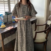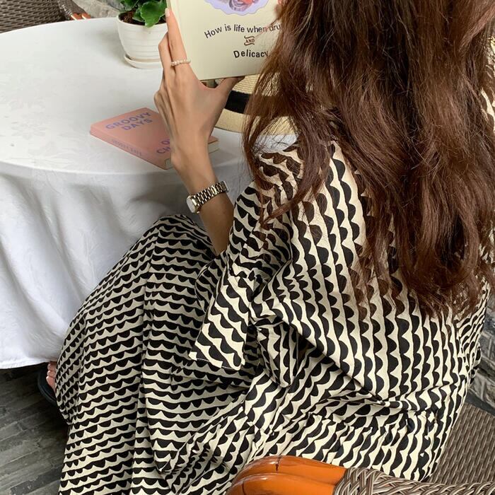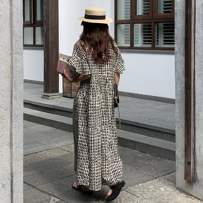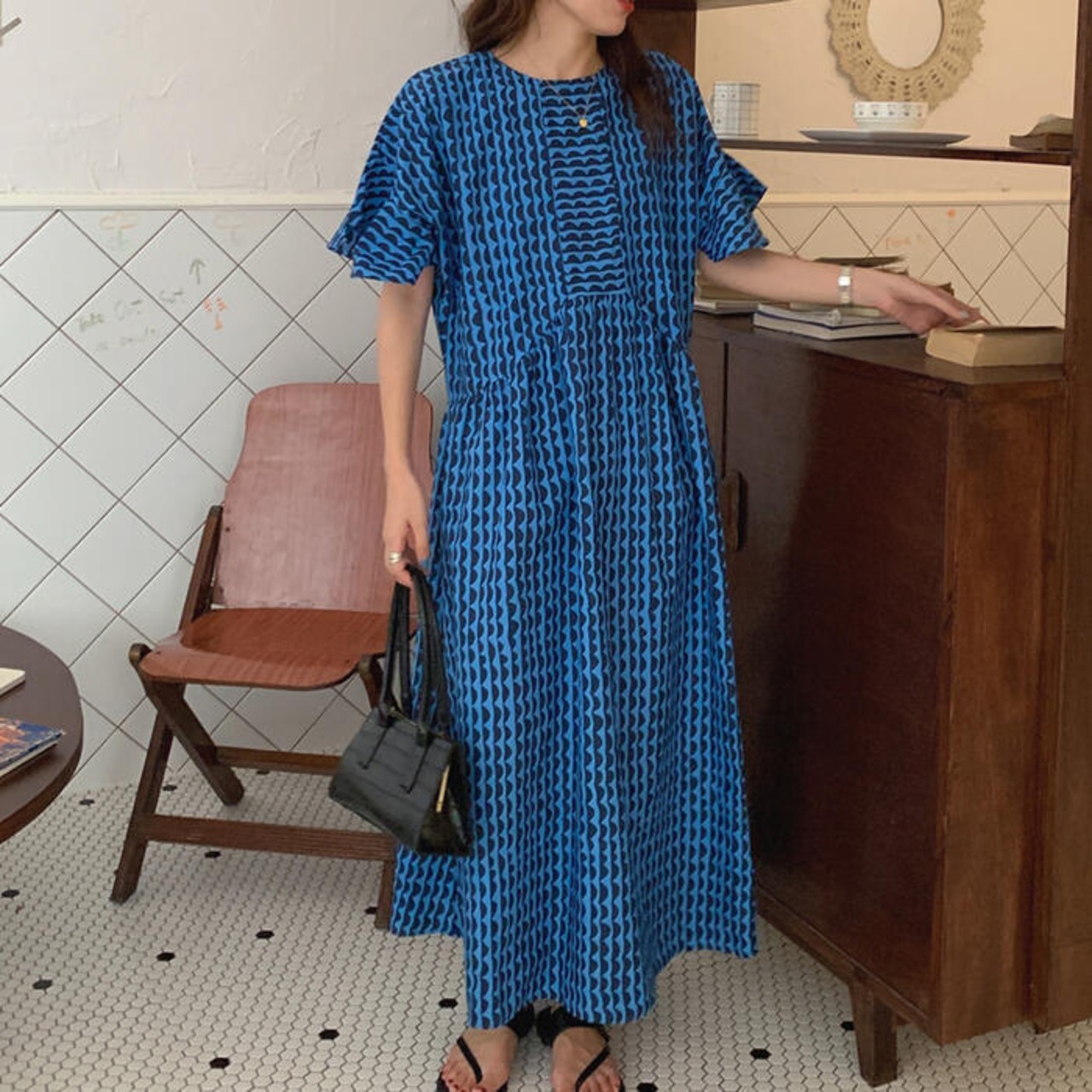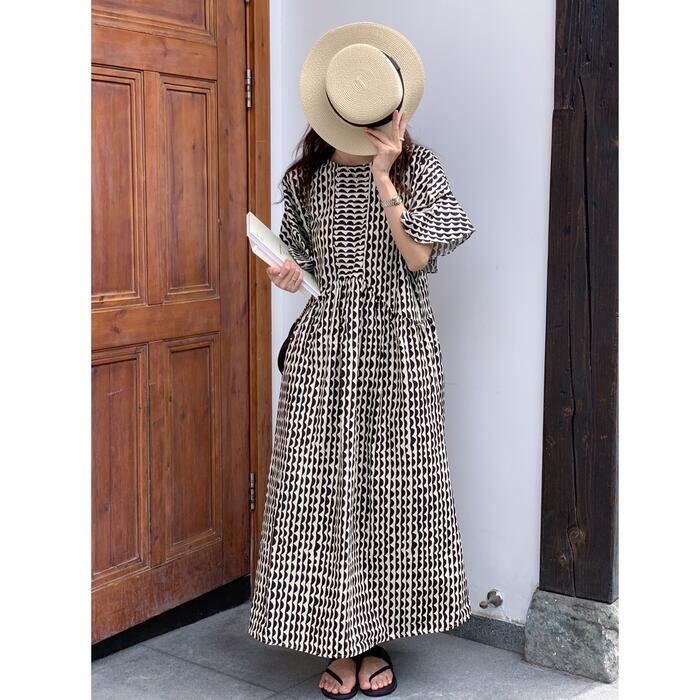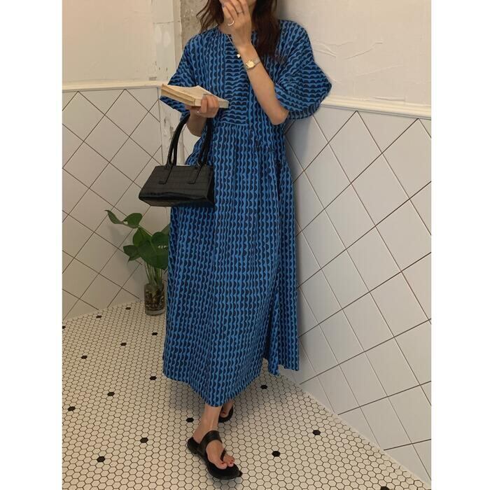 波柄が可愛い北欧風のロングワンピース。