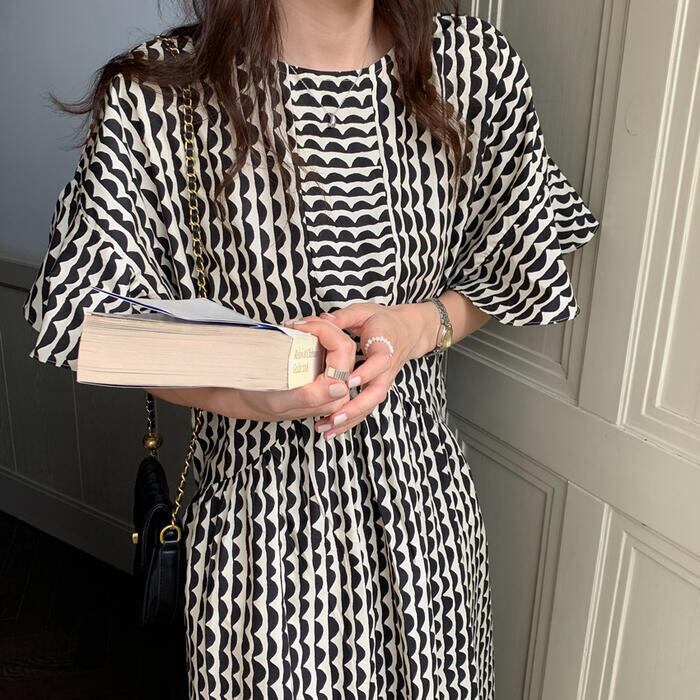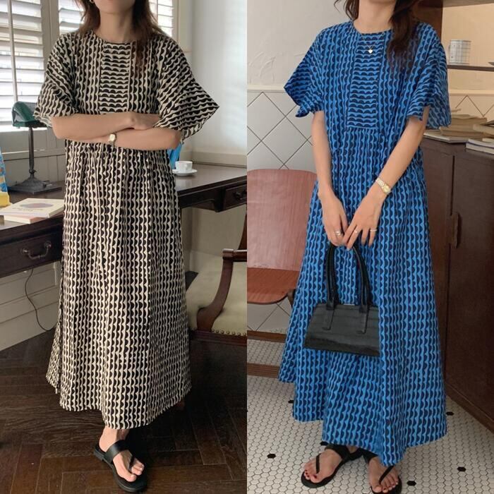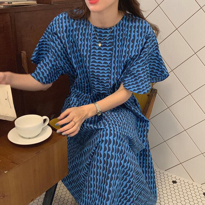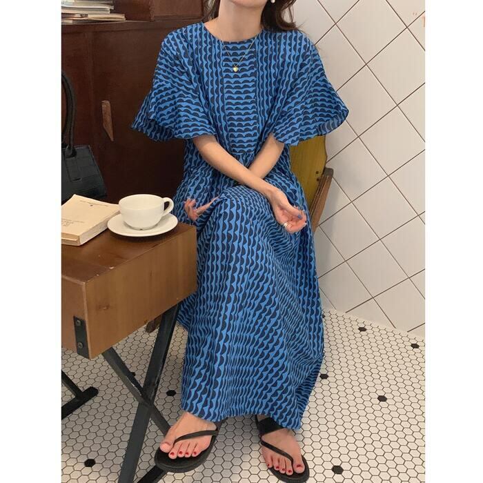 全2色 ワンピース 北欧 袖あり ロングワンピ ロング丈 レディース ワンピ ドレス 半袖 フレアスリーブ 波柄 きれいめ 大人可愛い カジュアル フェミニン ゆったり リラックス 体型カバー おしゃれ ブルー ベージュ 春 秋 夏 20代 30代 40代 50代