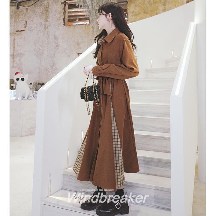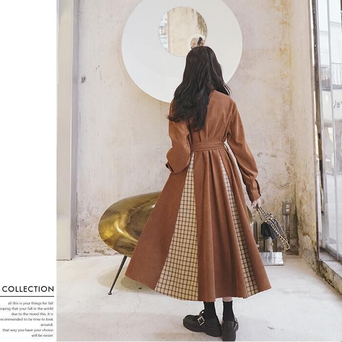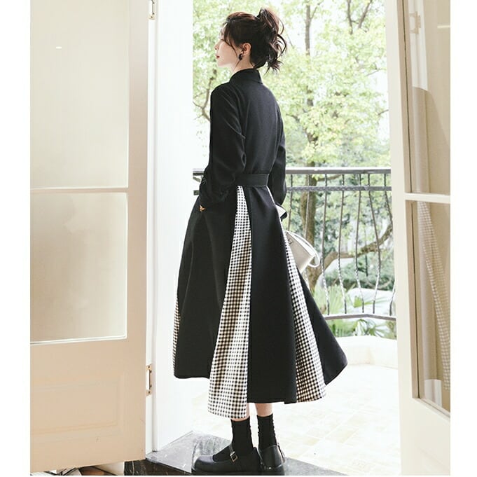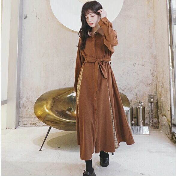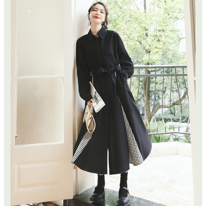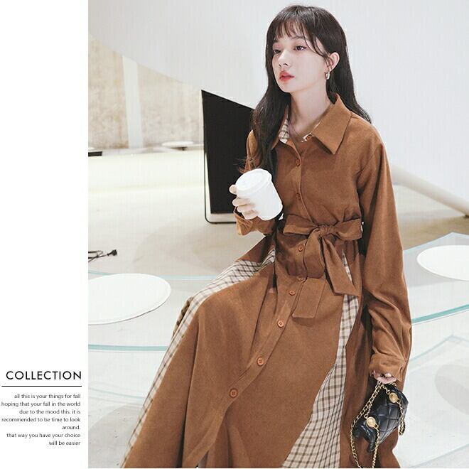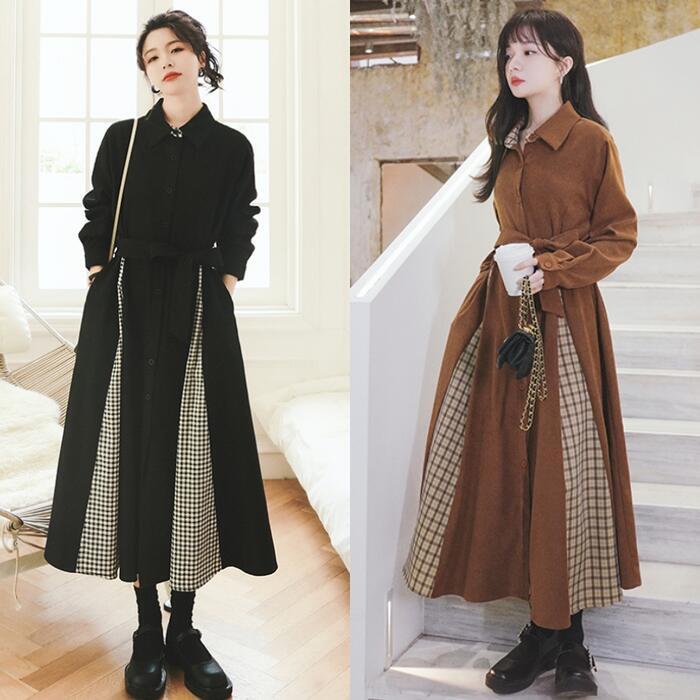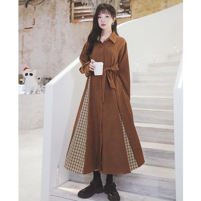 全2色 ワンピース 袖あり ロングワンピ ロング丈 レディース ワンピ ドレス 長袖 切り替え チェック きれいめ 大人可愛い カジュアル フェミニン Aライン ハイウエスト ウエストリボン おしゃれ ブラウン ブラック 黒 春 秋 冬 20代 30代 40代 50代