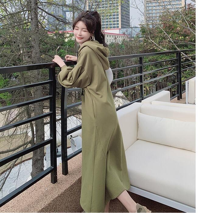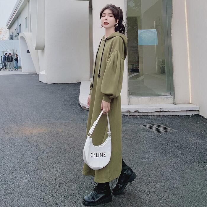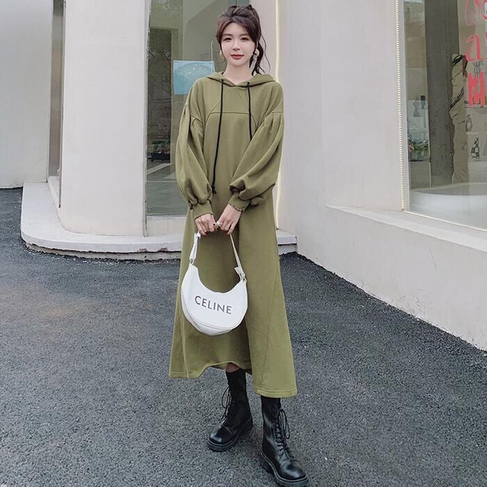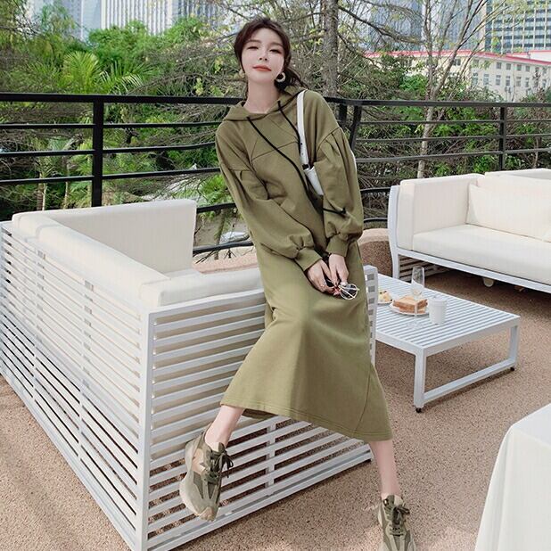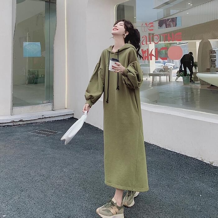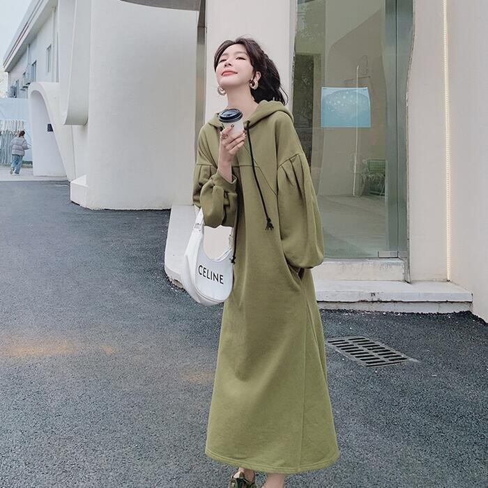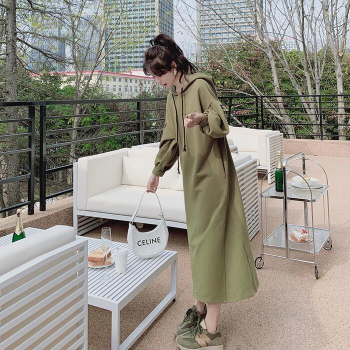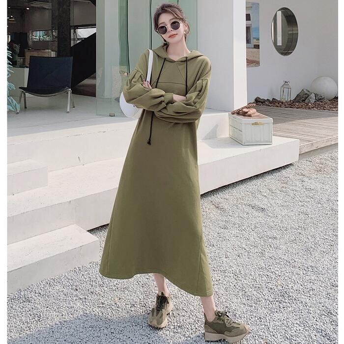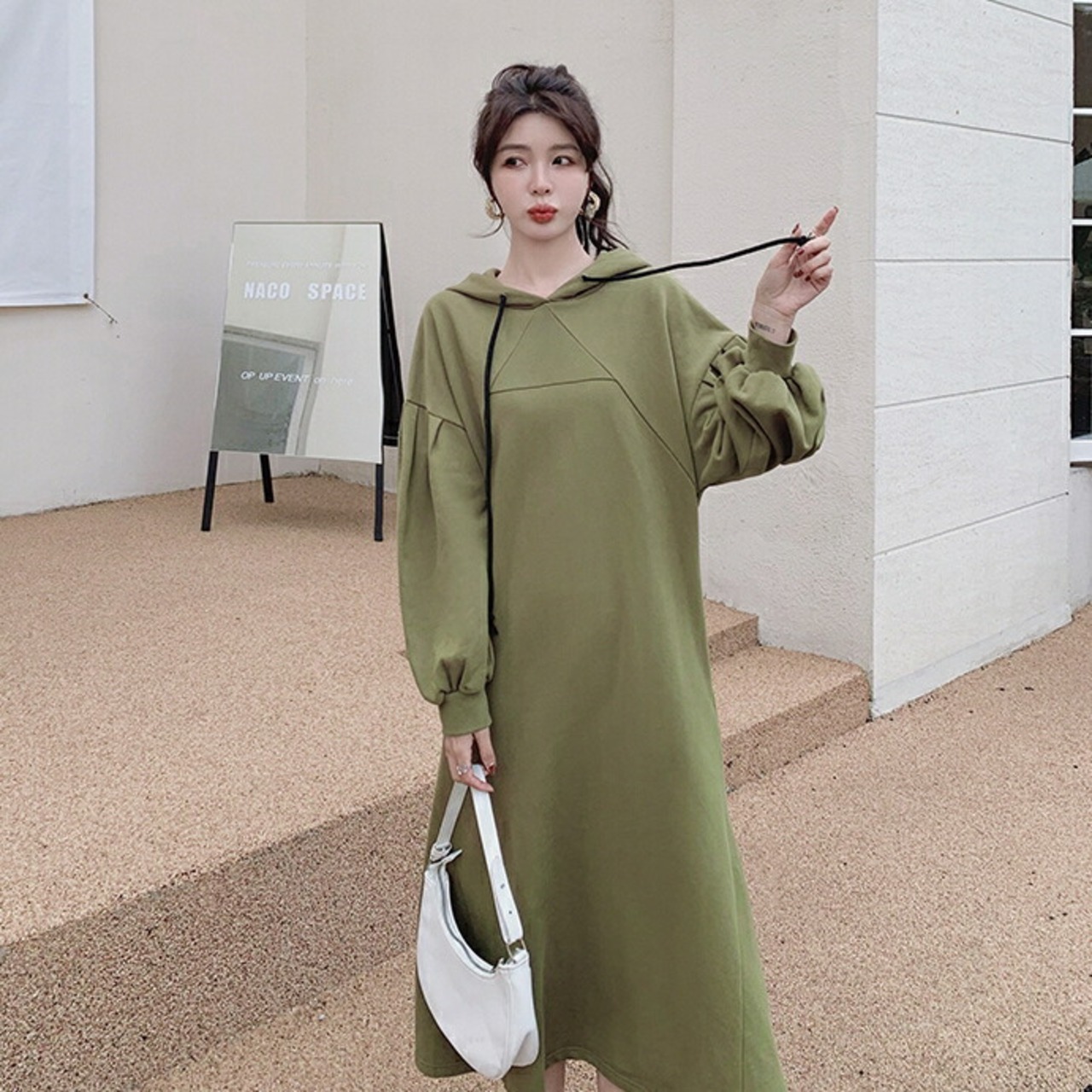 大きいサイズワンピース 袖あり ロングワンピ ロング丈 スウェット フード付き レディース ワンピ ドレス 長袖 きれいめ 大人可愛い カジュアル フェミニン Aライン ゆったり リラックス おしゃれ グリーン 緑 春 秋 冬 20代 30代 40代 50代