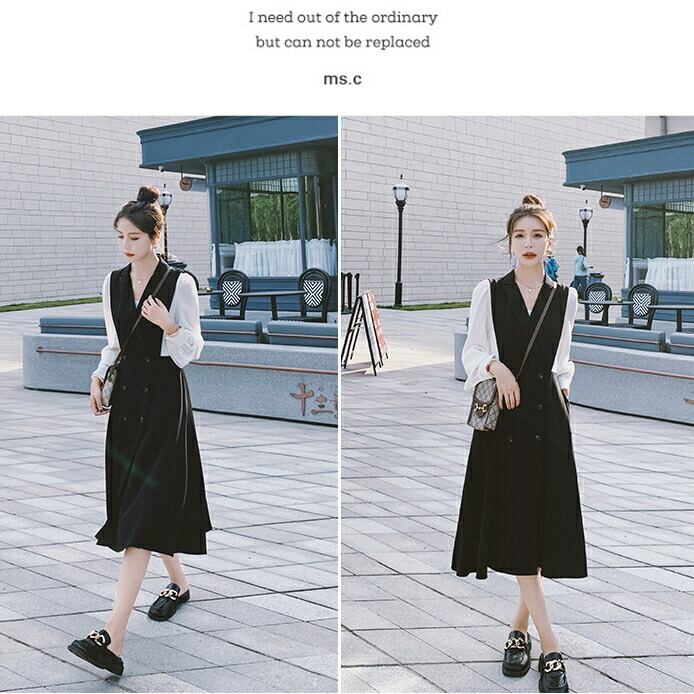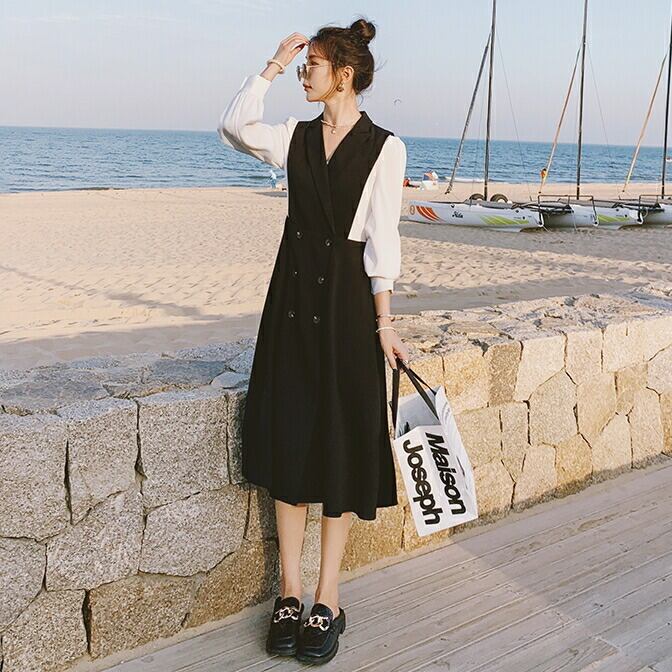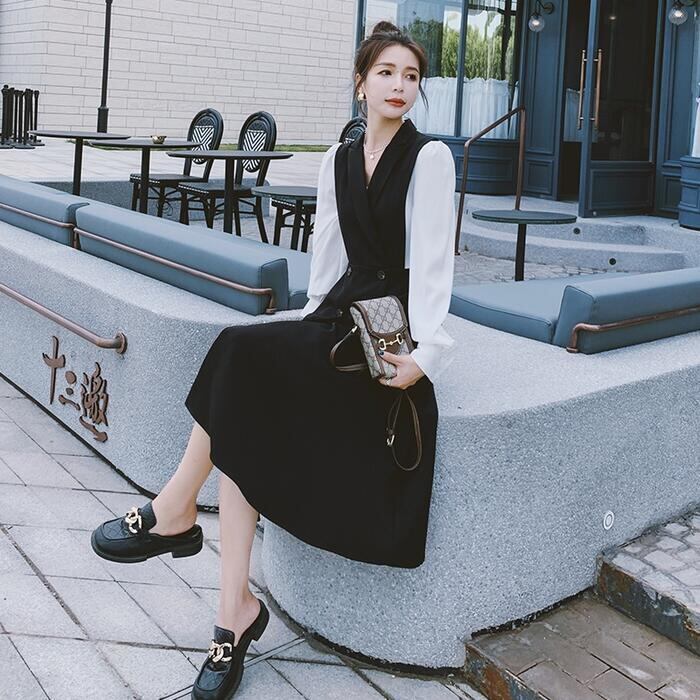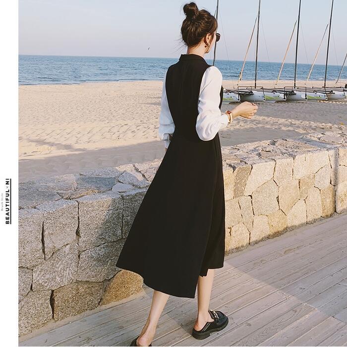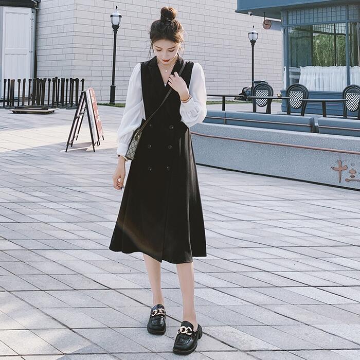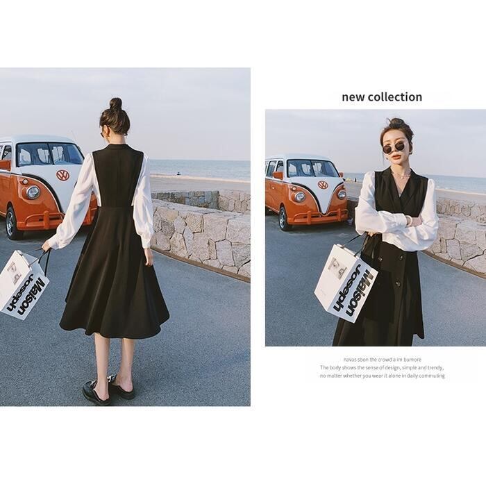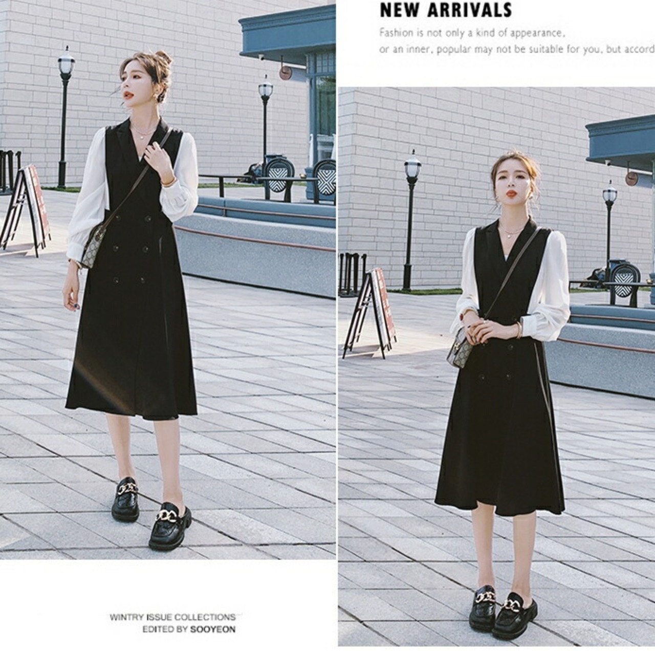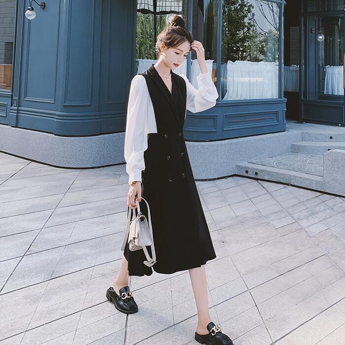 大きいサイズレイヤード風 ワンピース 袖あり ロングワンピ ミモレ丈 切り替え テーラードカラー レディース ワンピ ドレス 長袖 きれいめ 大人可愛い カジュアル フェミニン Aライン ゆったり おしゃれ ブラック 黒 春 秋 冬 20代 30代 40代 50代