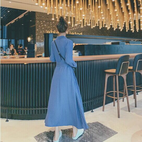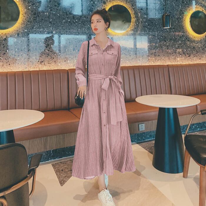 全2色 大きいサイズワンピース 袖あり ロングワンピ ロング丈 ストライプ シャツワンピース レディース ワンピ ドレス 長袖 きれいめ 大人可愛い カジュアル フェミニン Aライン ハイウエスト おしゃれ ブルー 青 ピンク 春 秋 冬 20代 30代 40代 50代