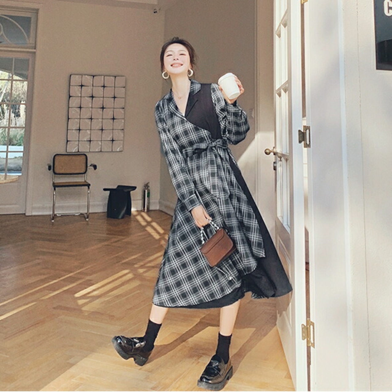 ワンピース 袖あり ロングワンピ ミモレ丈 レディース チェック 切り替え ワンピ ドレス 長袖 きれいめ 大人可愛い カジュアル フェミニン ウエストリボン ハイウエスト おしゃれ ブラック 黒 春 秋 冬 20代 30代 40代 50代