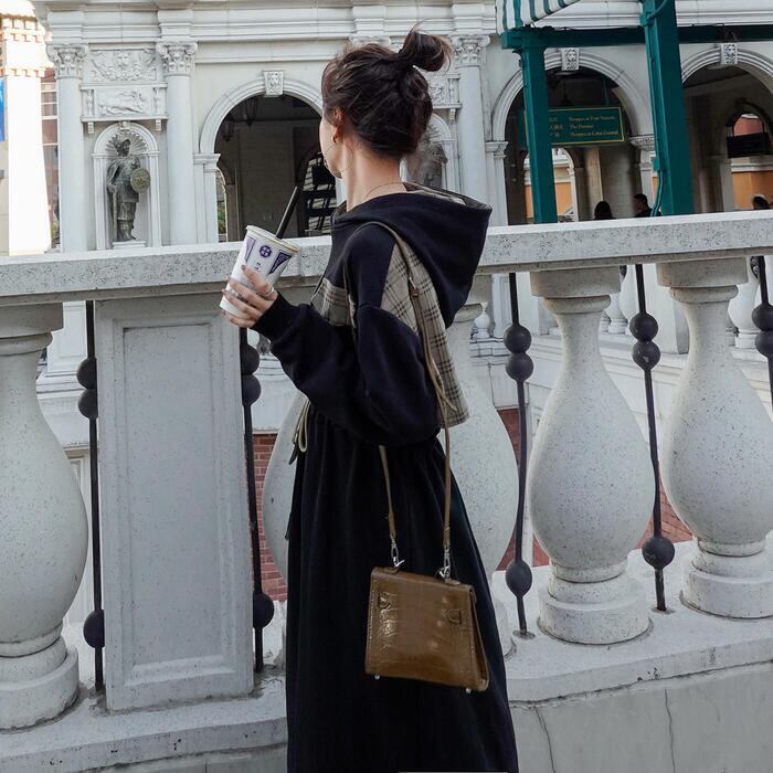 ポイント使いのチェック柄が可愛いフード付きスウェットワンピース。