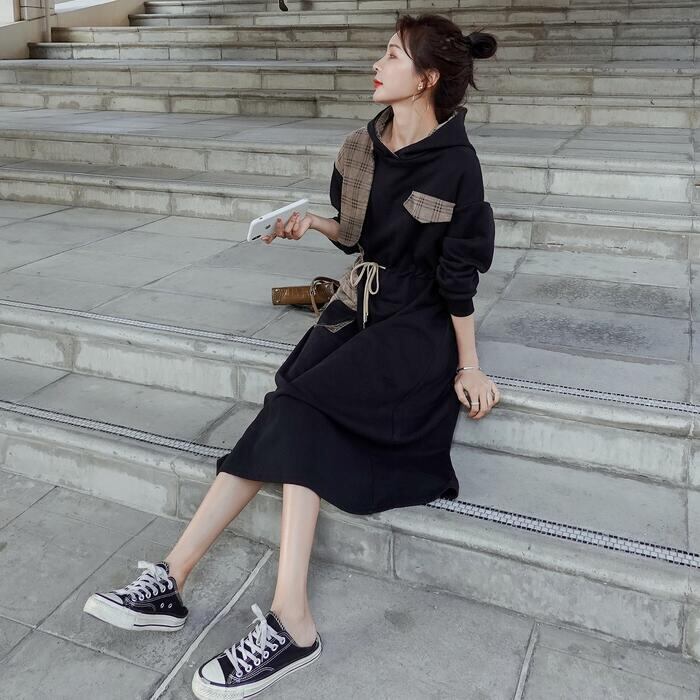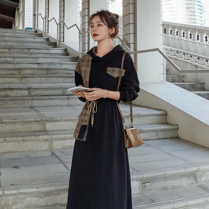 大きいサイズワンピース 袖あり ロングワンピ ミモレ丈 レディース チェック 切り替え スウェット フード付き ワンピ ドレス 長袖 きれいめ 大人可愛い カジュアル フェミニン ウエストリボン ハイウエスト おしゃれ ブラック 黒 春 秋 冬 20代 30代 40代 50代