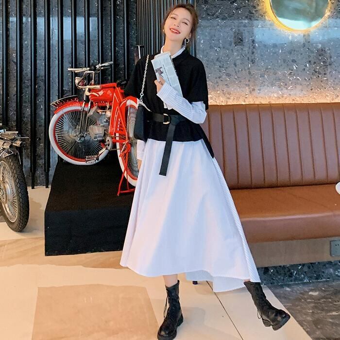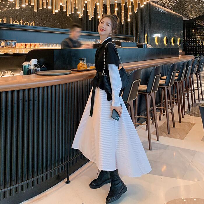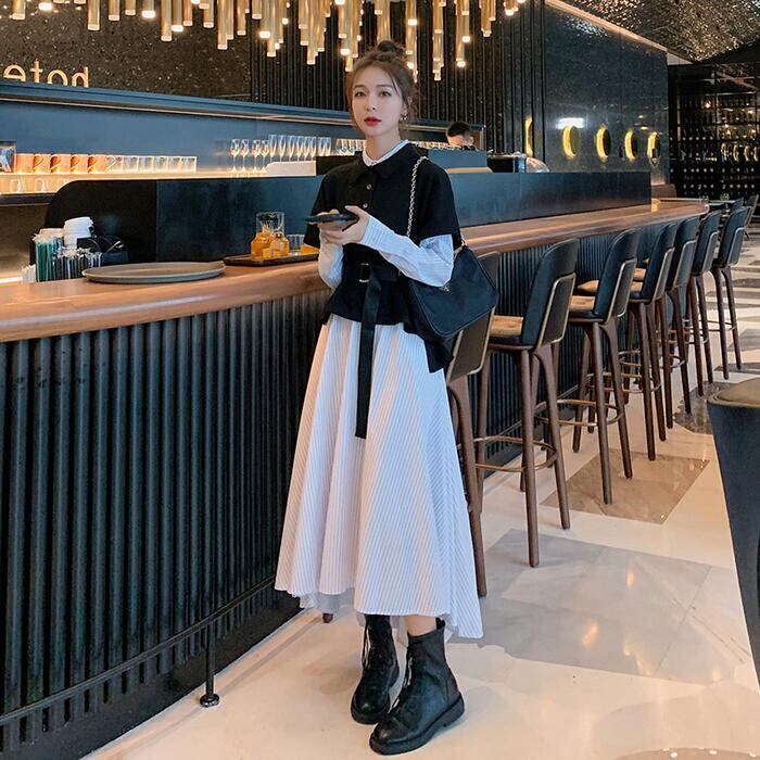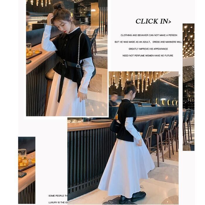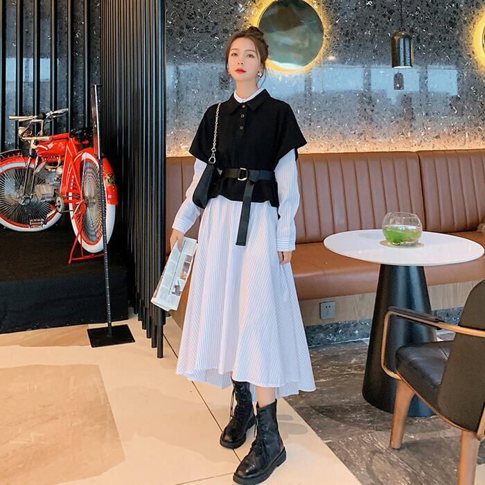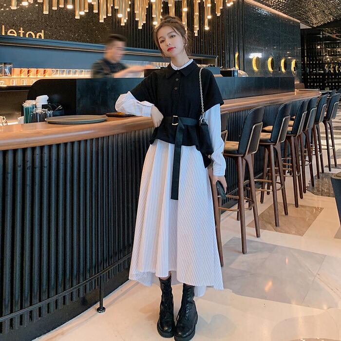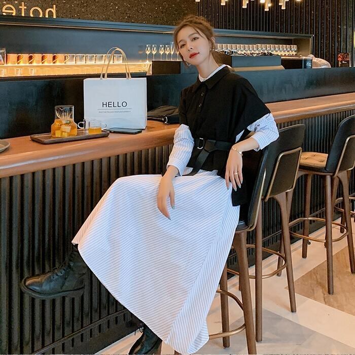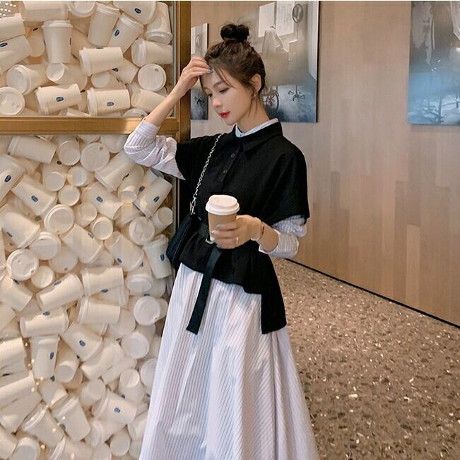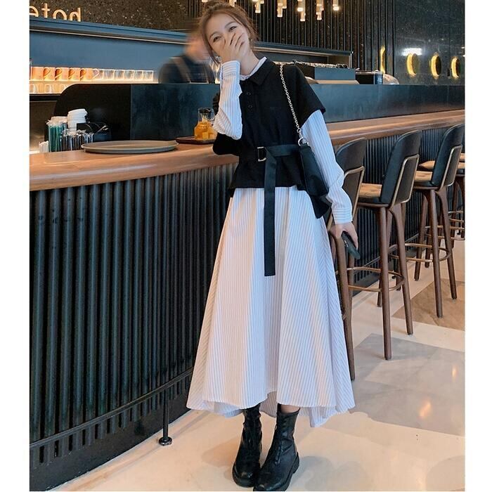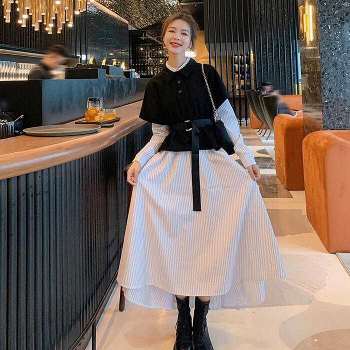 大きいサイズレイヤード風 ワンピース 袖あり ロングワンピ ロング丈 レディース ストライプ シャツワンピース ワンピ ドレス 長袖 きれいめ 大人可愛い カジュアル フェミニン ハイウエスト おしゃれ ブラック 黒 春 秋 冬 20代 30代 40代 50代