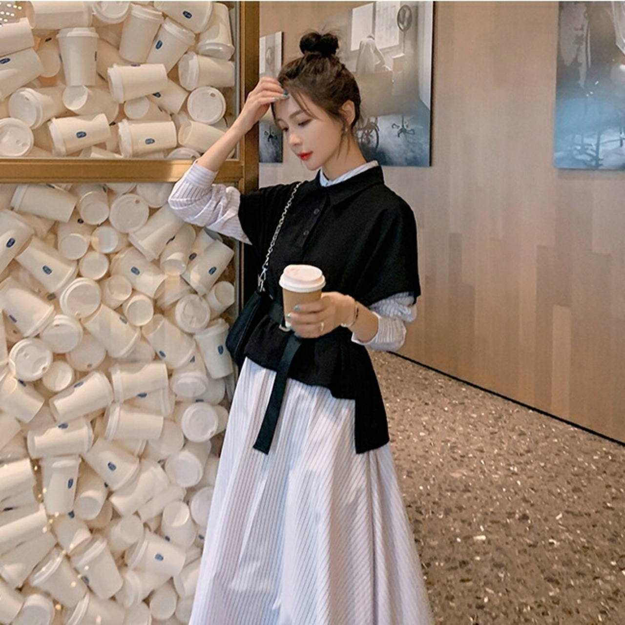 レイヤード風デザインがおしゃれなストライプ柄シャツワンピース。
