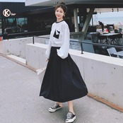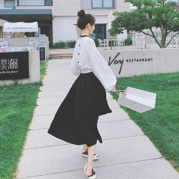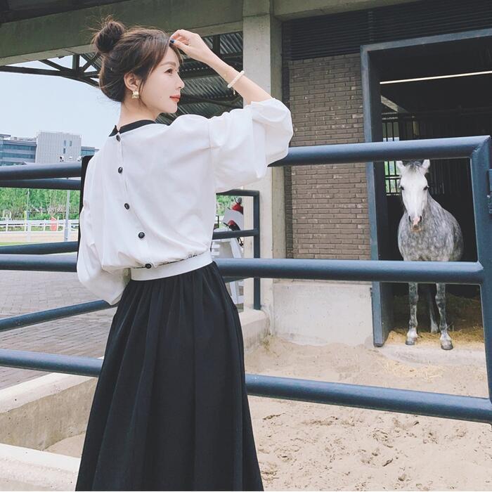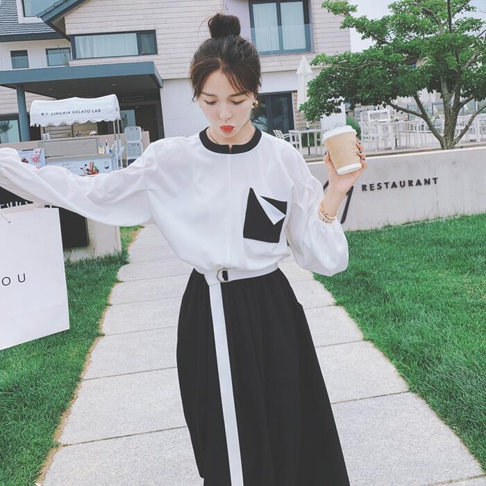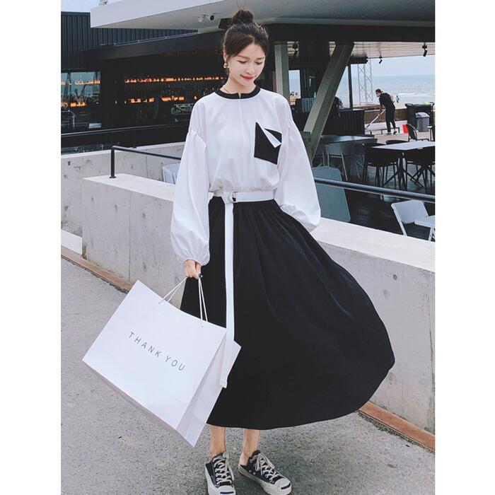 大きいサイズワンピース 袖あり ロングワンピ ミモレ丈 レディース バイカラー シャツワンピース ワンピ ドレス 長袖 きれいめ 大人可愛い カジュアル フェミニン ハイウエスト おしゃれ ブラック 黒 春 秋 冬 20代 30代 40代 50代