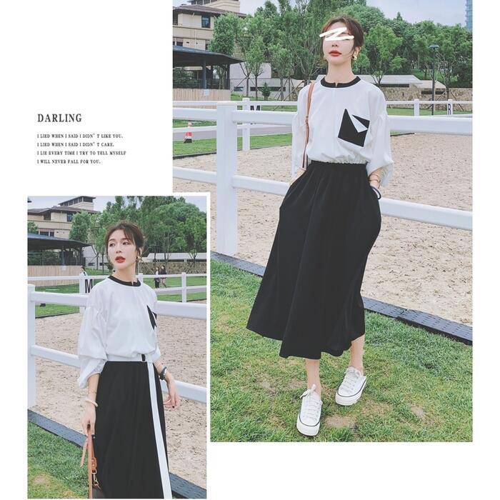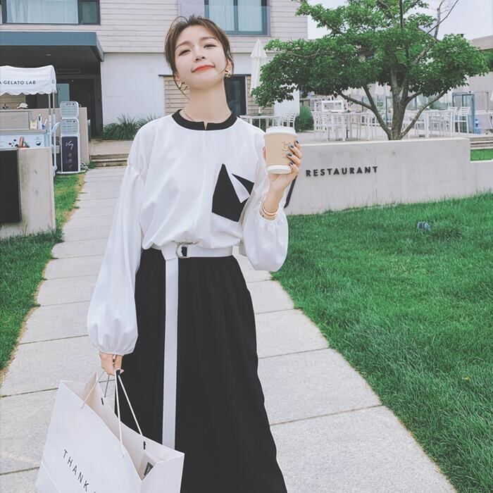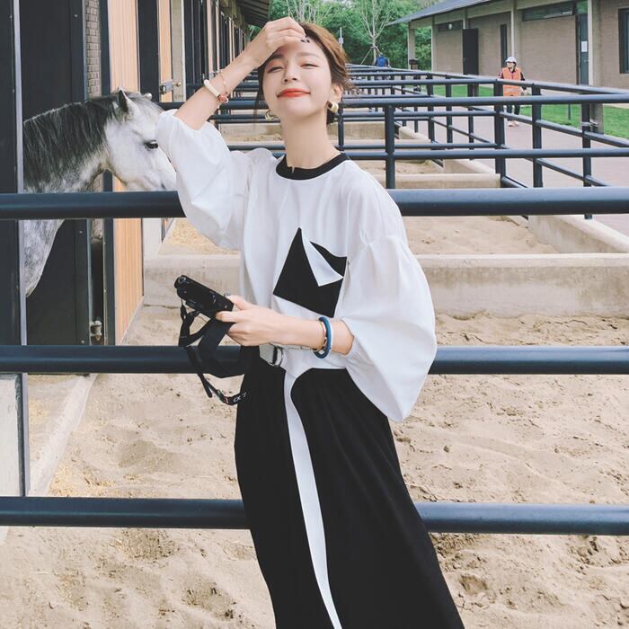 モードな雰囲気漂うバイカラーワンピース。