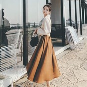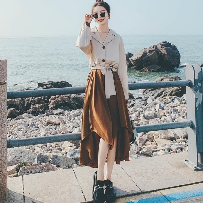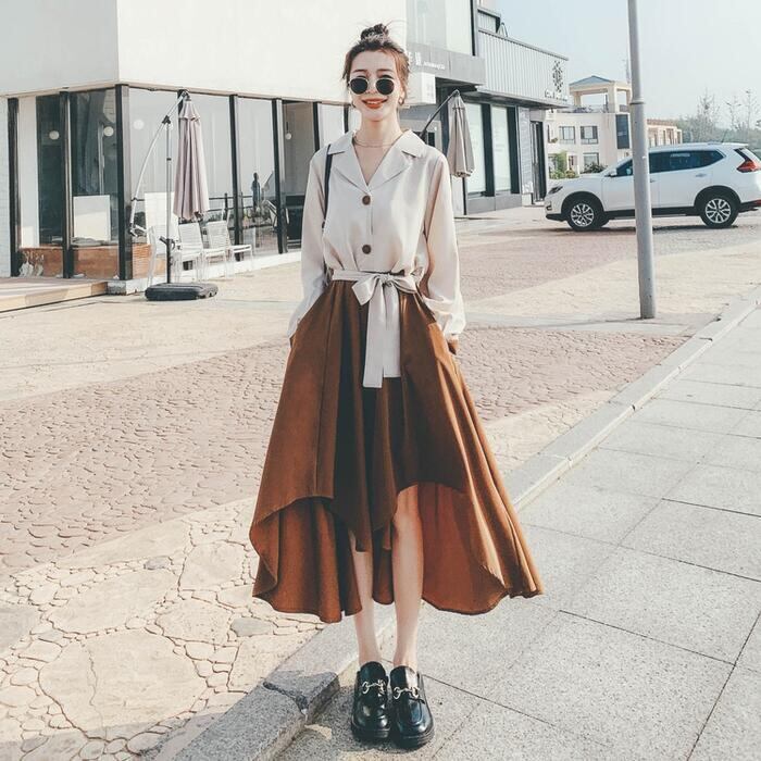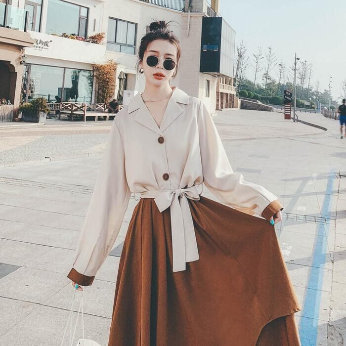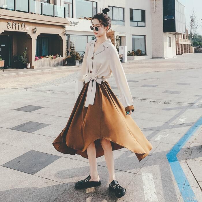 大きいサイズセパレート風 ワンピース 袖あり ロングワンピ ロング丈 レディース バイカラー シャツワンピース ワンピ ドレス 長袖 きれいめ 大人可愛い カジュアル フェミニン ハイウエスト おしゃれ ブラウン 春 秋 冬 20代 30代 40代 50代