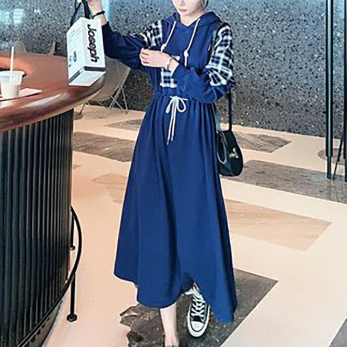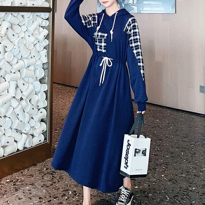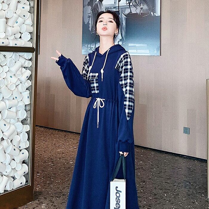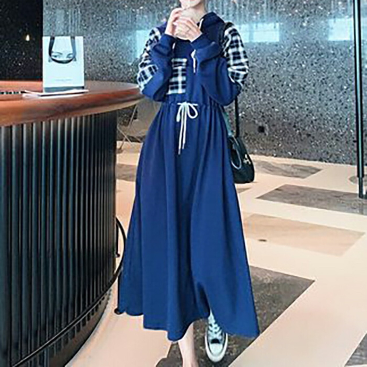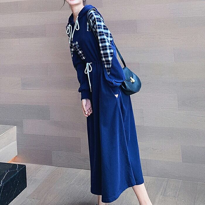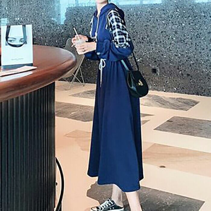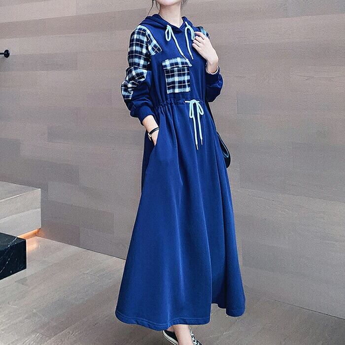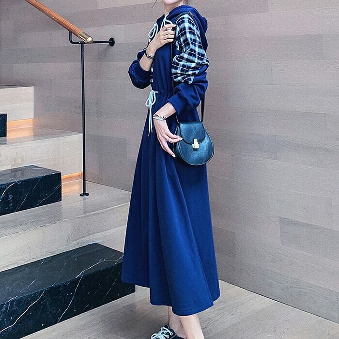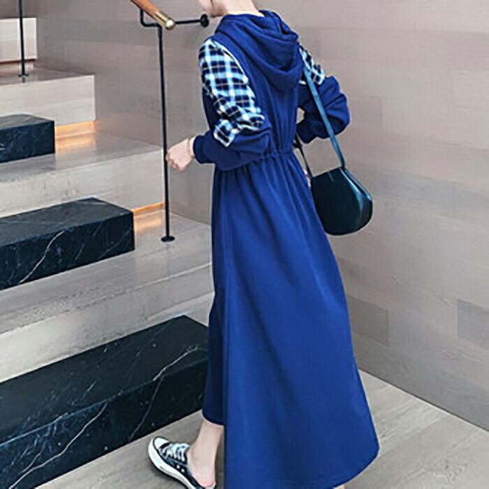 ワンピース 袖あり ロングワンピ きれいめ カジュアル 配色 切り替え 体型カバー 長袖 ロング丈 レディース ワンピ スリム ゆったり 大人可愛い フェミニン ハイウエスト Aライン ブルー 春 秋 冬 20代 30代 40代 50代