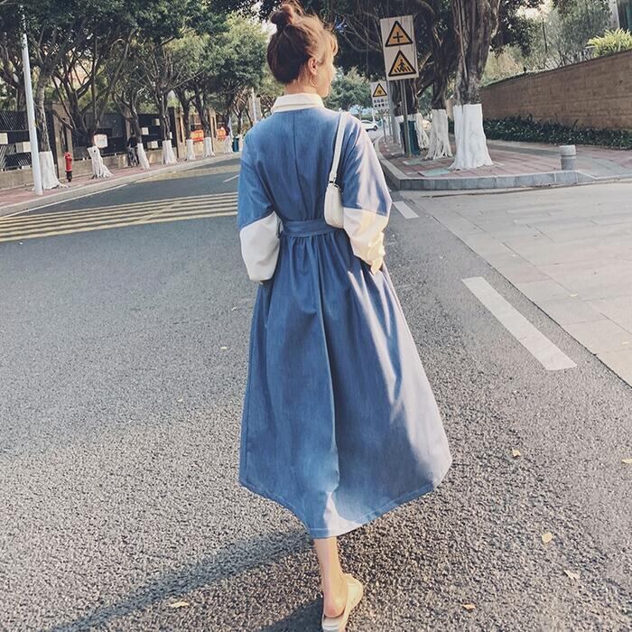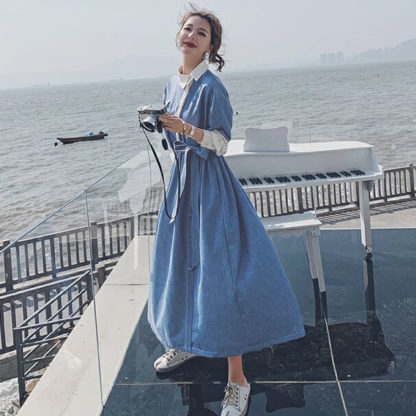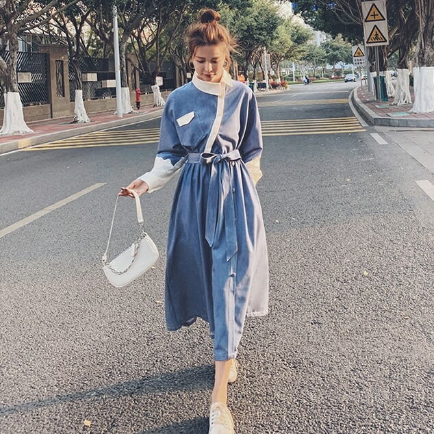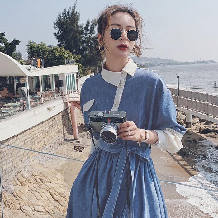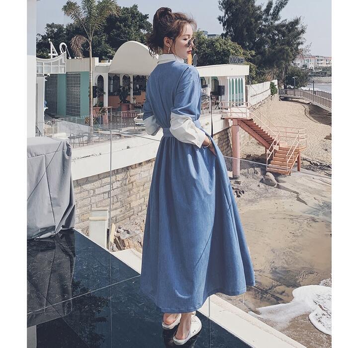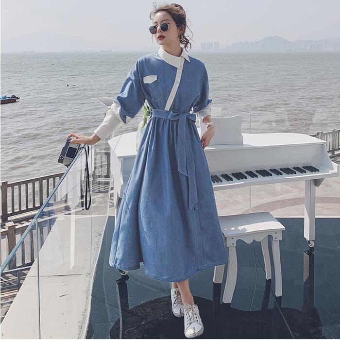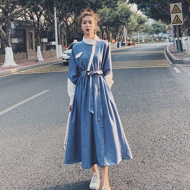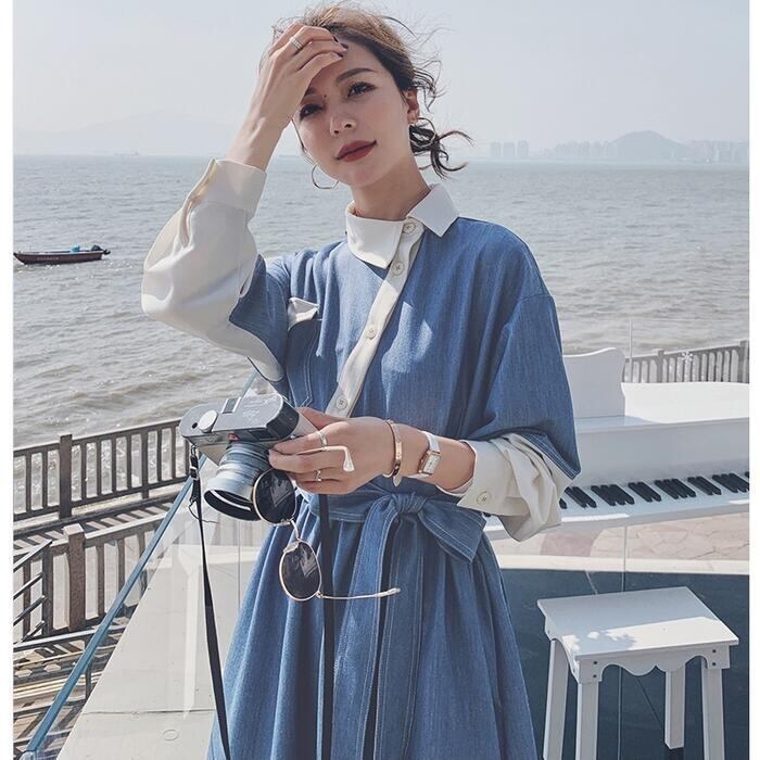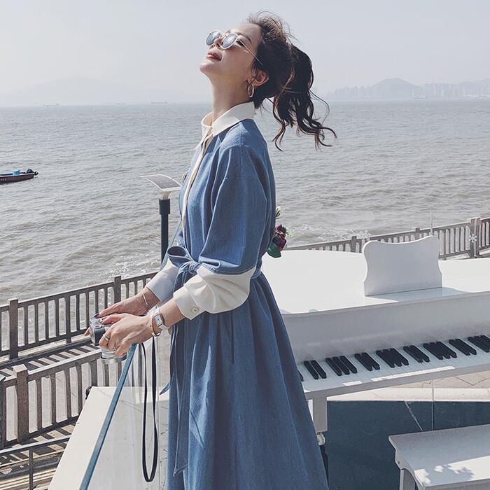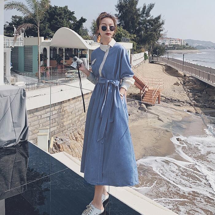 大きいサイズワンピース 袖あり ロングワンピ ミモレ丈 レディース アシンメトリー デニム 切り替え ワンピ ドレス 長袖 きれいめ 大人可愛い カジュアル フェミニン ハイウエスト ウエストリボン 韓国 おしゃれ ブルー 青 春 秋 冬 20代 30代 40代 50代