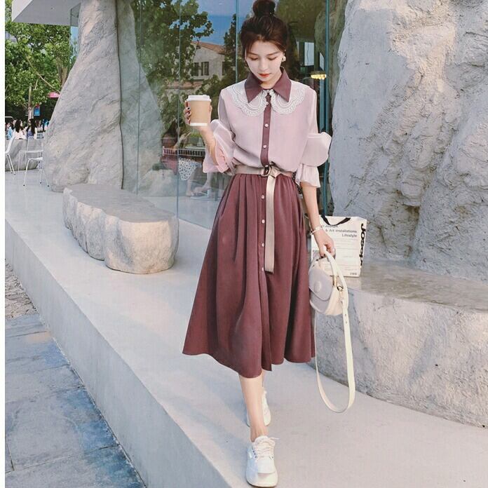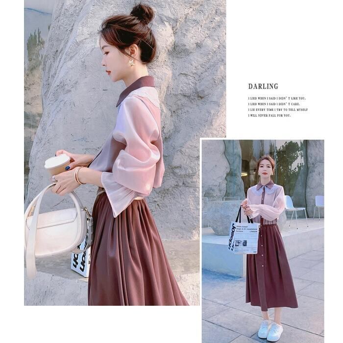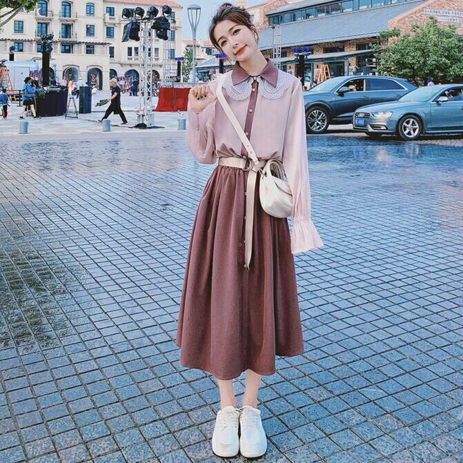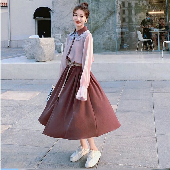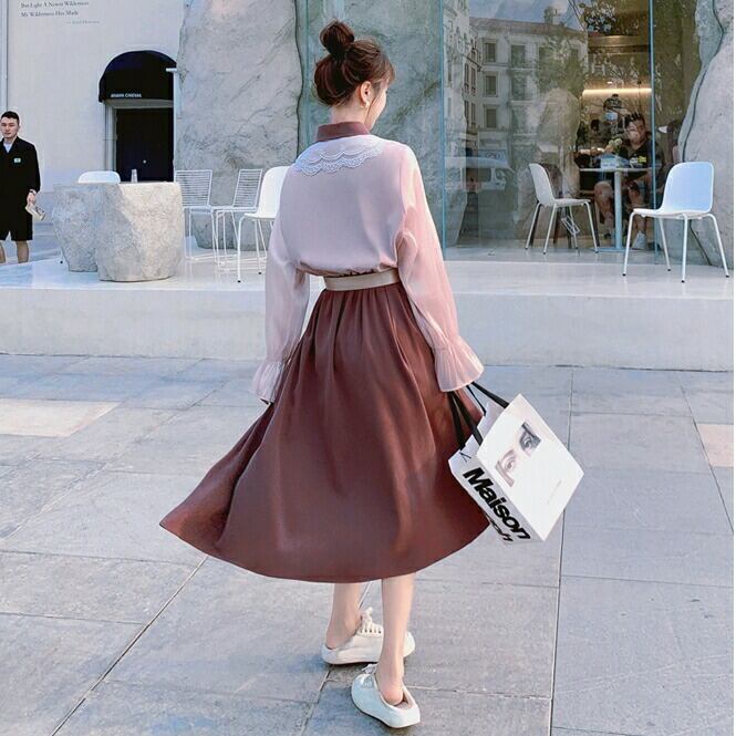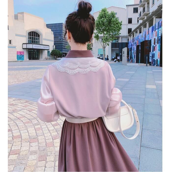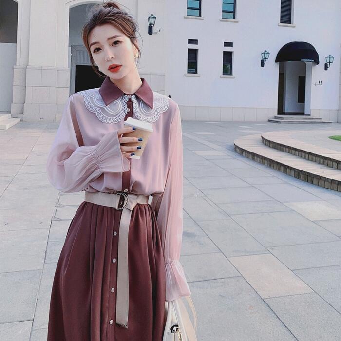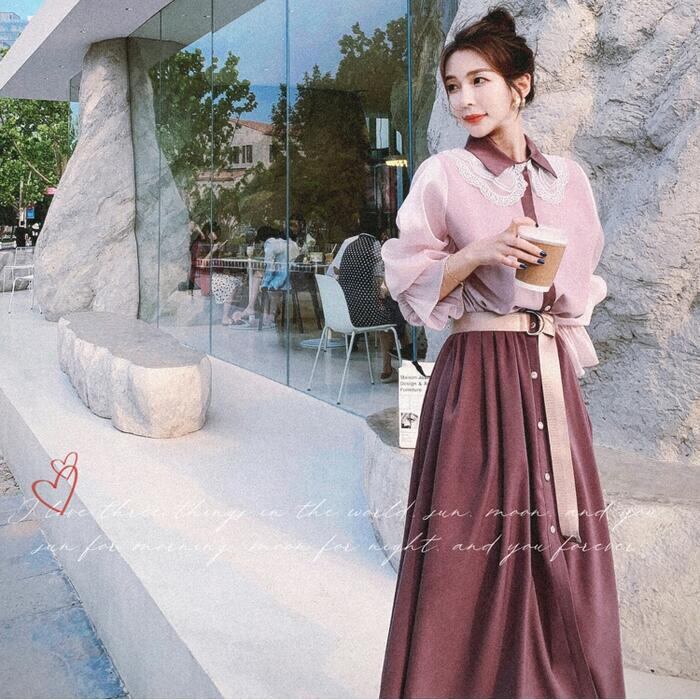 大きいサイズワンピース レース クラシカル 袖あり ロングワンピ ミモレ丈 レディース シャツワンピース 配色 切り替え ワンピ ドレス 長袖 きれいめ 大人可愛い カジュアル フェミニン ハイウエスト 韓国 おしゃれ ピンク パープル 春 秋 冬 20代 30代 40代 50代