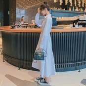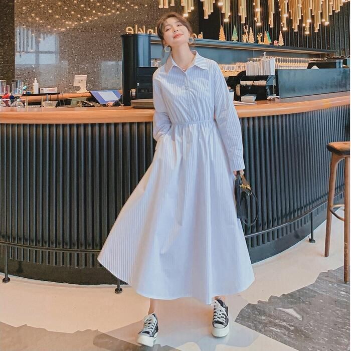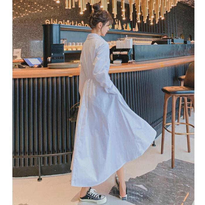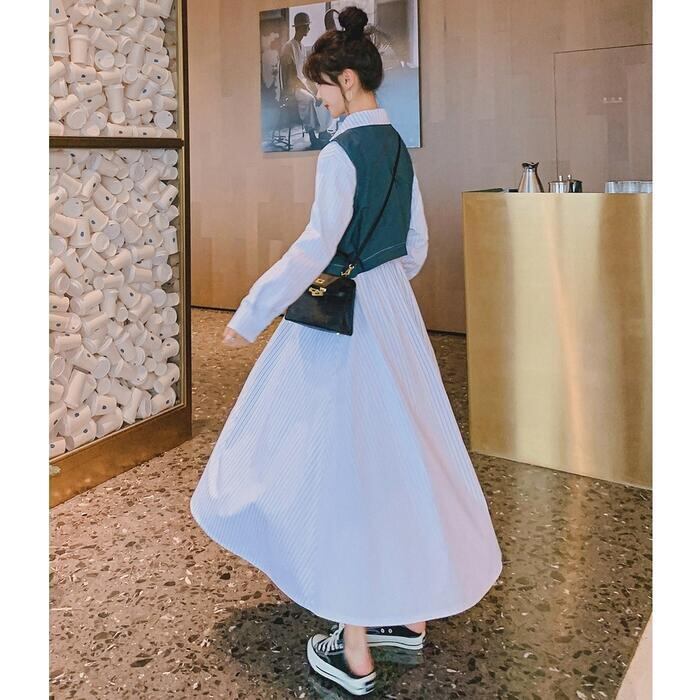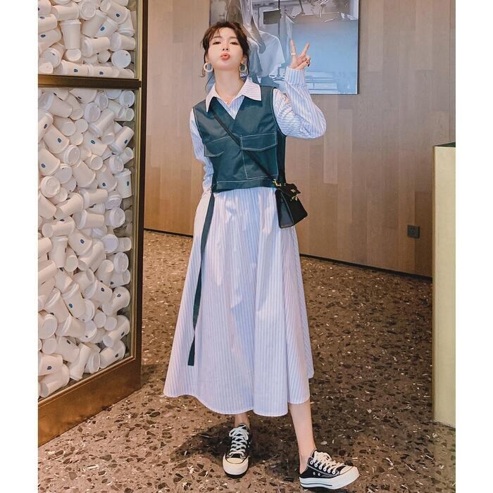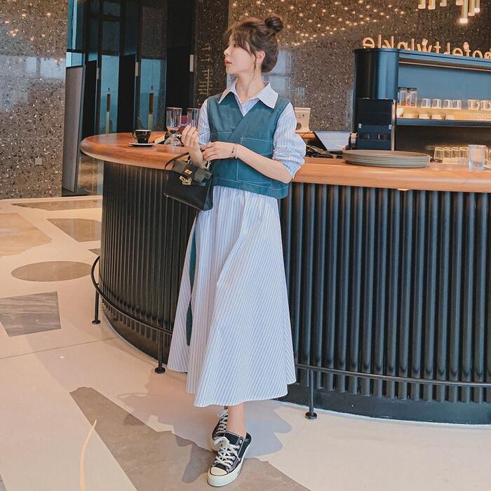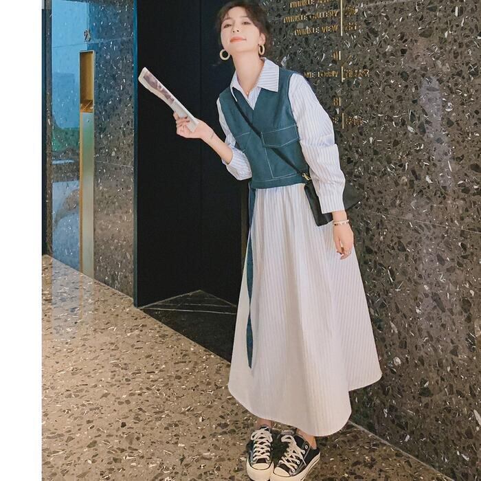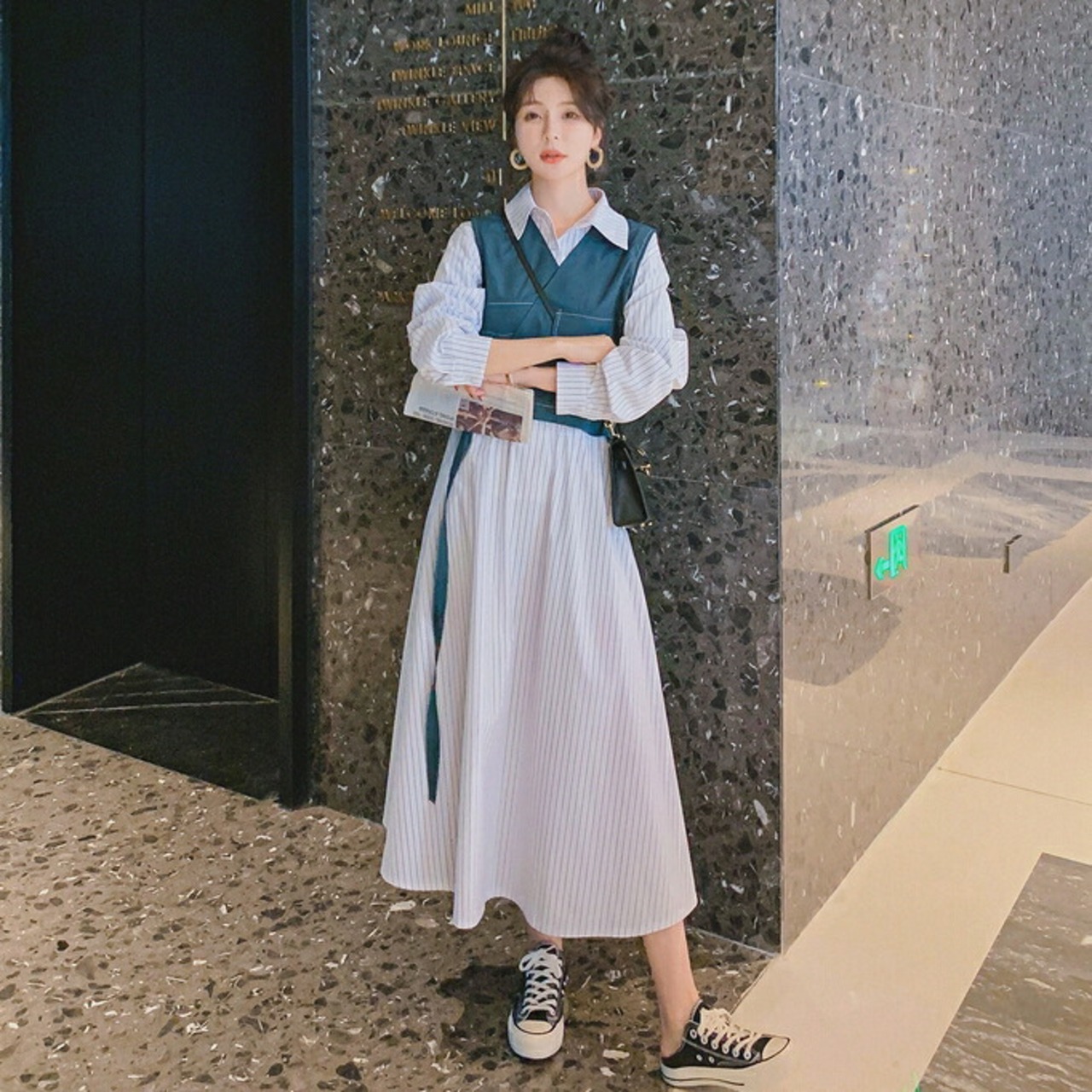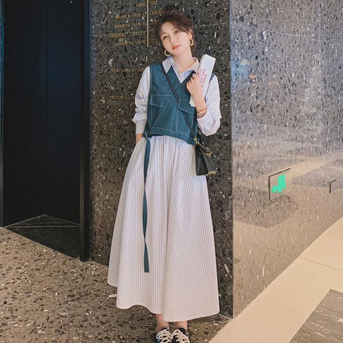 大きいサイズレイヤード ワンピース 袖あり ロングワンピ ミモレ丈 ストライプ ベスト シャツワンピ レディース ワンピ ドレス 長袖 きれいめ 大人可愛い カジュアル フェミニン ハイウエスト 2点セット 韓国 おしゃれ ホワイト 白 春 秋 冬 20代 30代 40代 50代