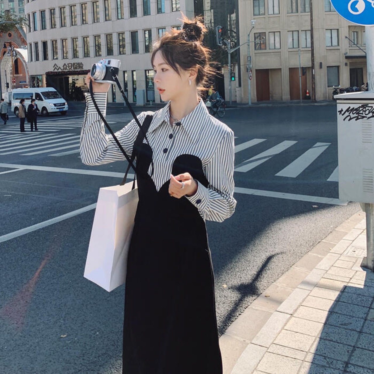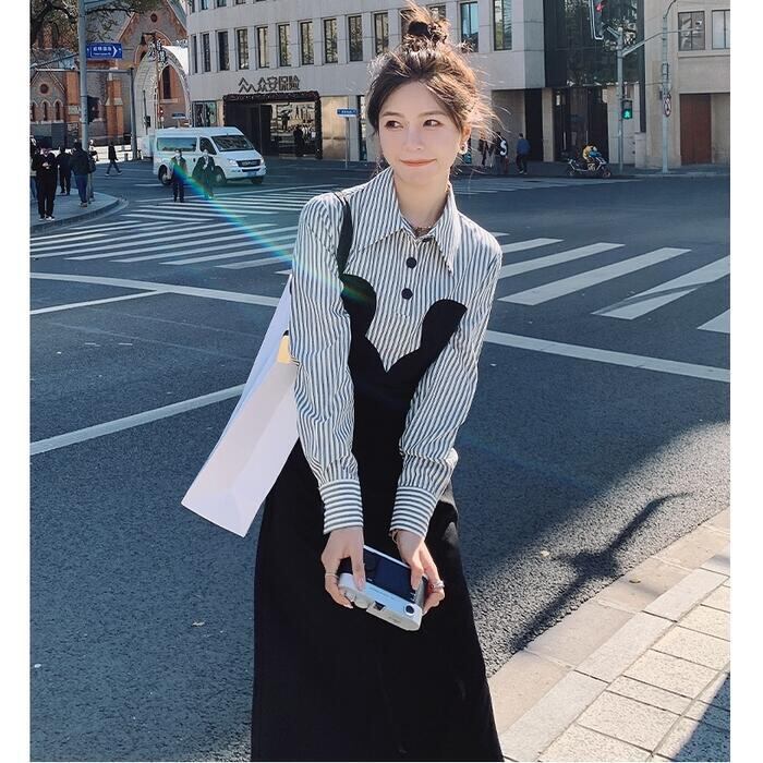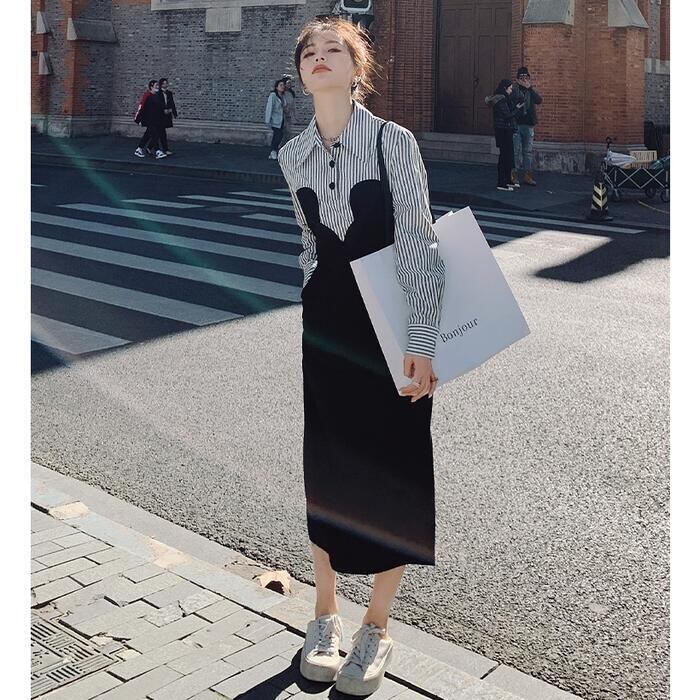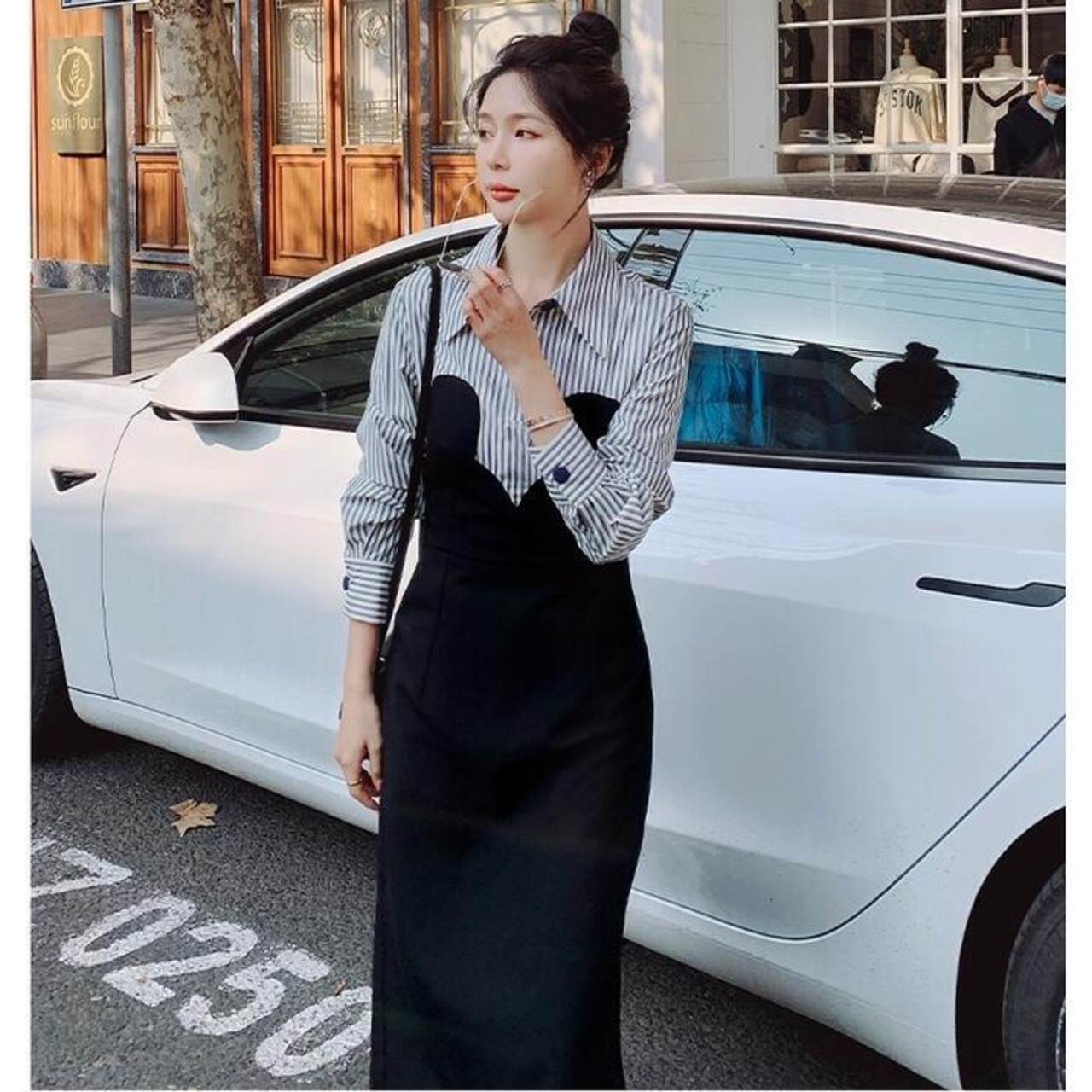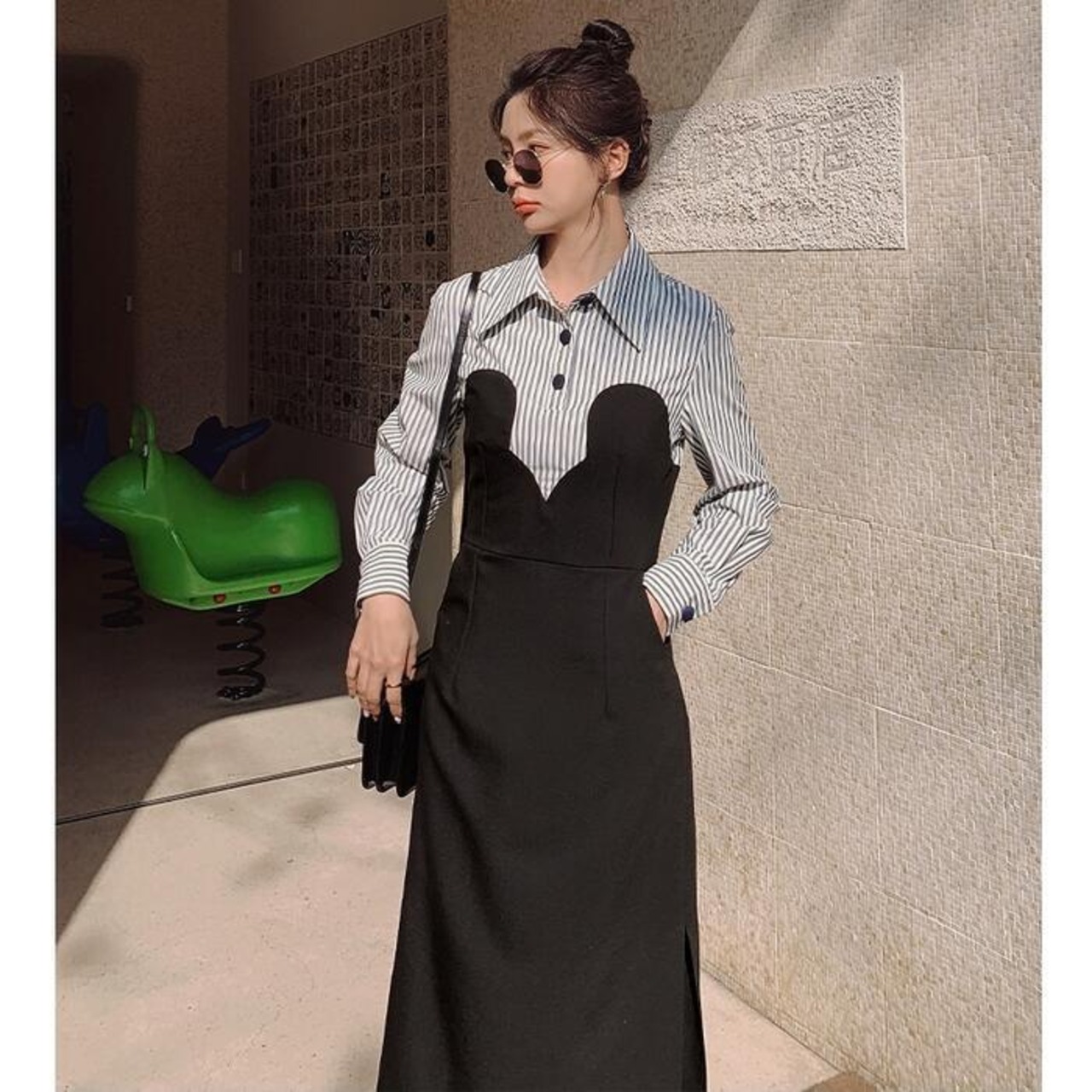 大きいサイズレイヤード風 ワンピース 切り替え 袖あり ロングワンピ ミモレ丈 ストライプ レディース ワンピ ドレス 長袖 きれいめ 大人可愛い カジュアル フェミニン シャツワンピ 韓国 おしゃれ ブラック 黒 春 秋 冬 20代 30代 40代 50代