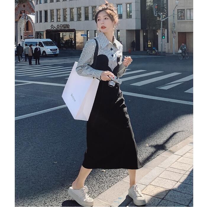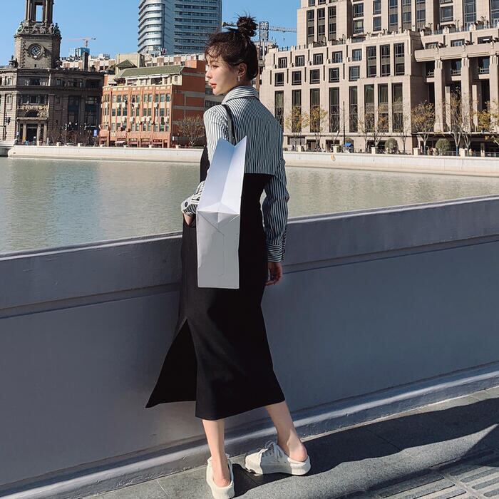 ストライプシャツにビスチェワンピースを合わせたようなレイヤード風デザイン。