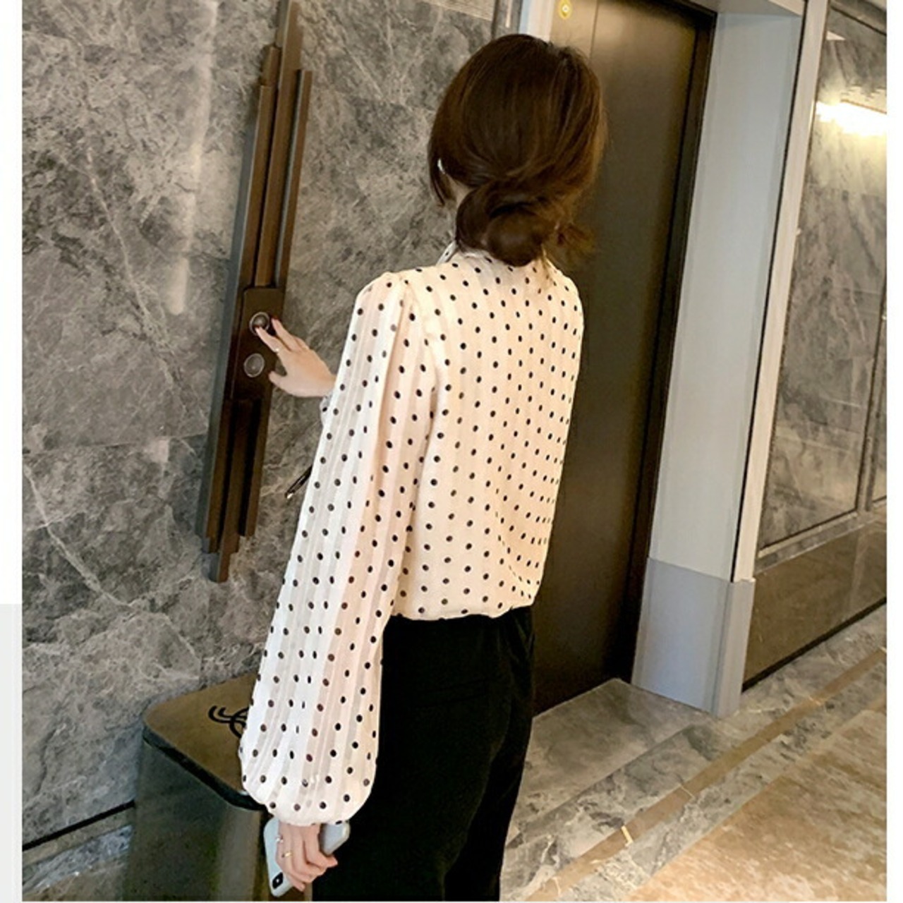 ストライプ×ドット柄が華やかなボウタイブラウス。