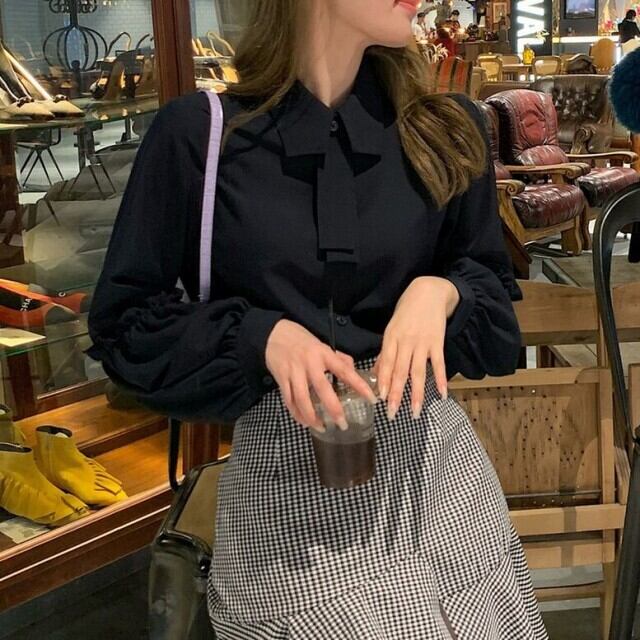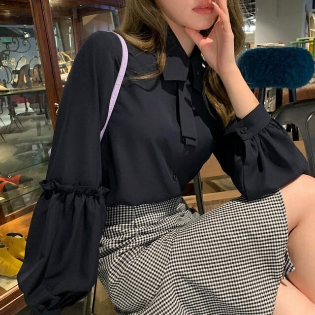 袖コンシャス トップス ボウタイ ブラウス シャツ フリル レディース きれいめ カジュアル 長袖 ボリューム袖 おしゃれ 大人 可愛い フェミニン エレガント クラシカル ブラック 黒 春 冬 秋 20代 30代 40代 50代