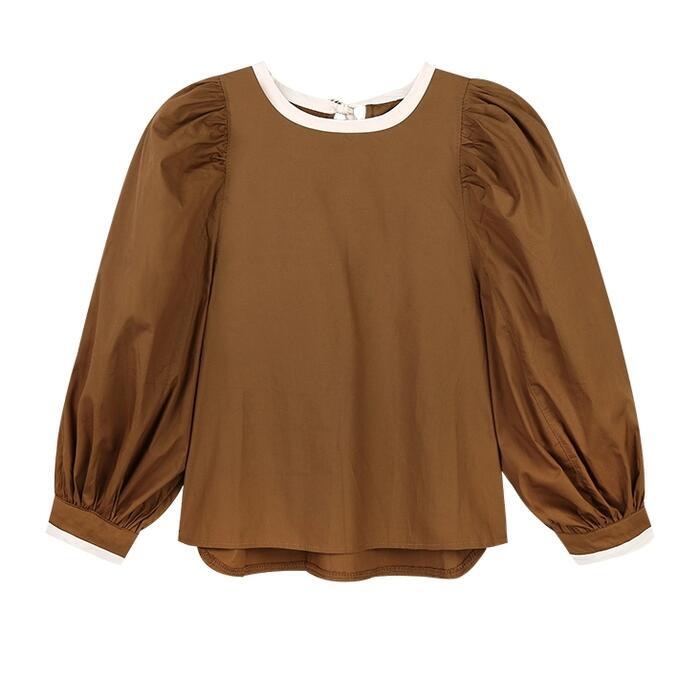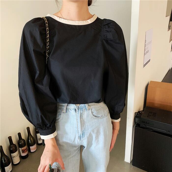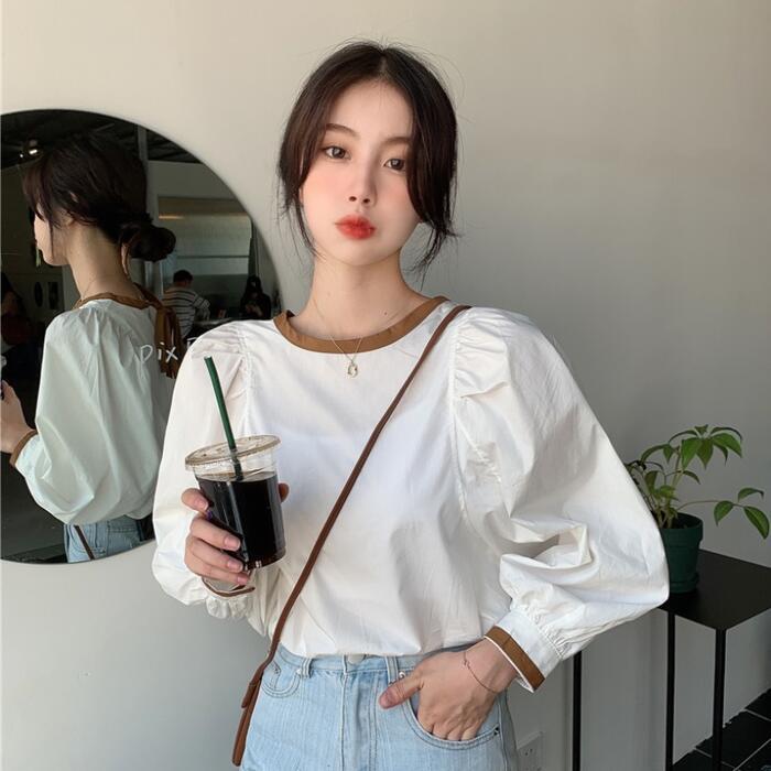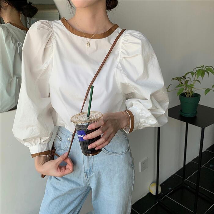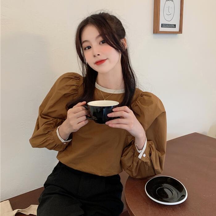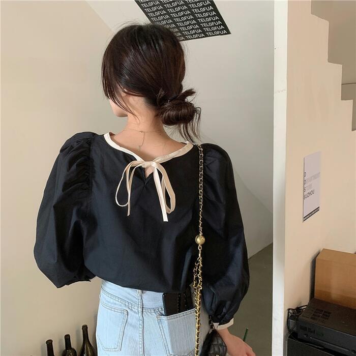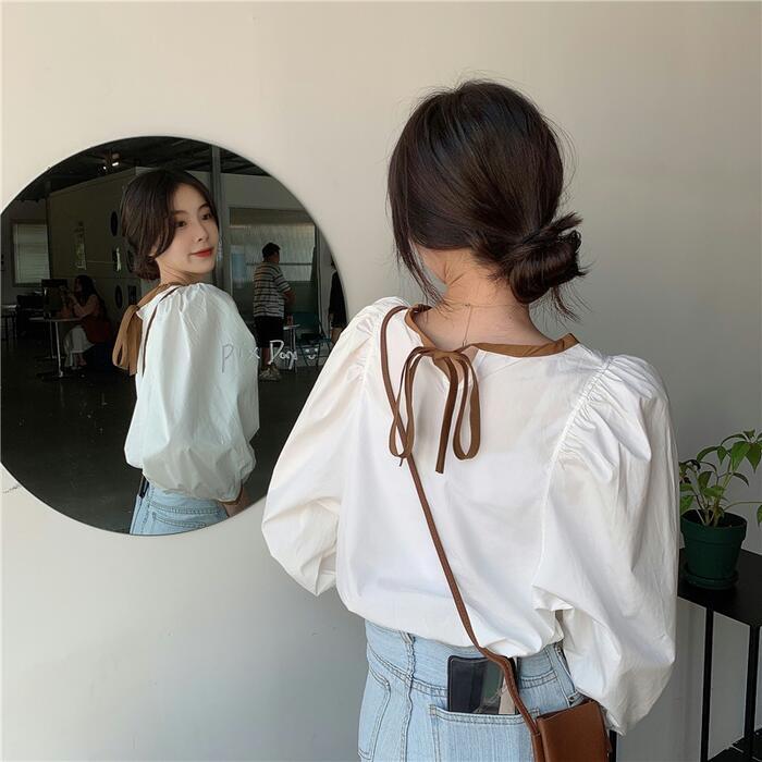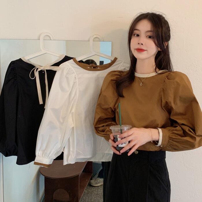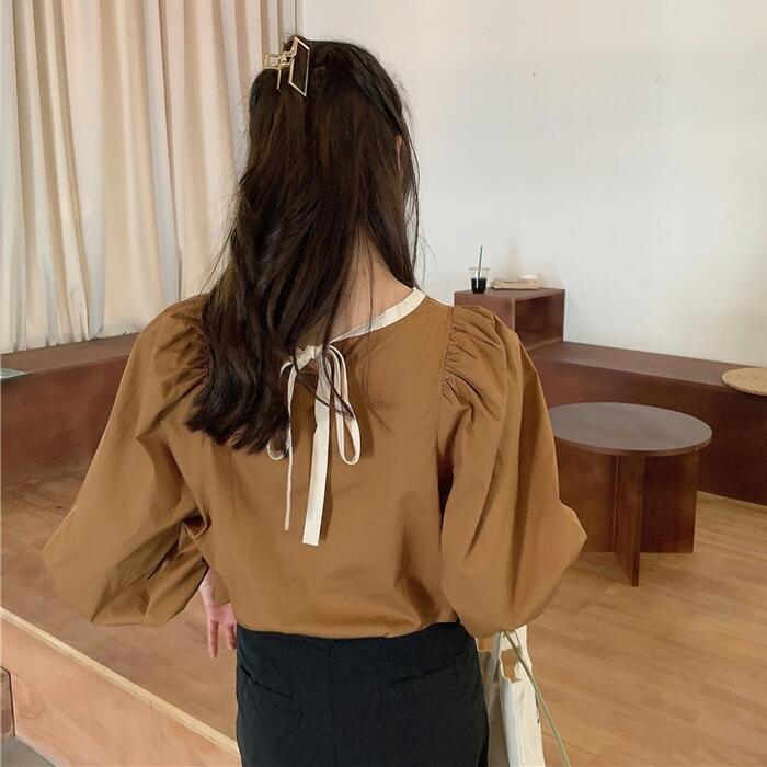 全3色 トップス シャツ ブラウス パフスリーブ レディース カジュアル バックリボン 長袖 おしゃれ 大人 可愛い フェミニン 配色 ゆったり プルオーバー シンプル ブラウン ブラック 黒 ホワイト 白 春 冬 秋 20代 30代 40代 50代