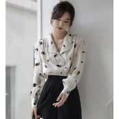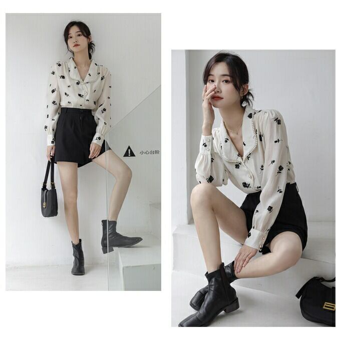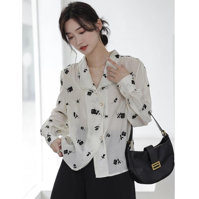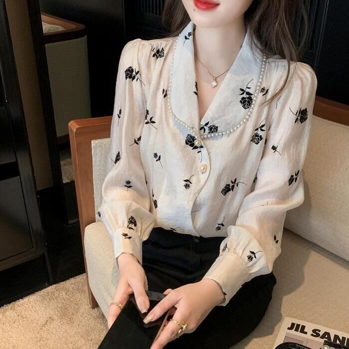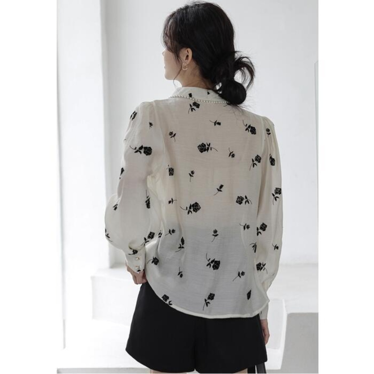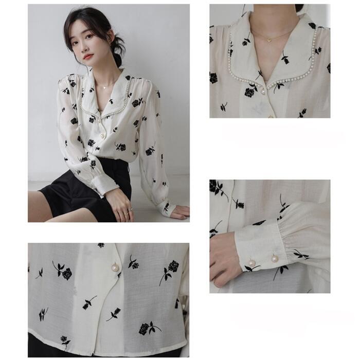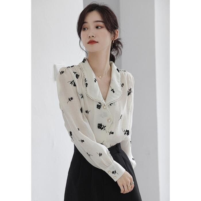 襟周りにパールをあしらったエレガントなシフォンブラウス。