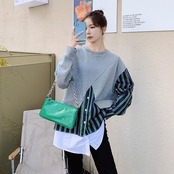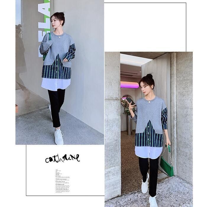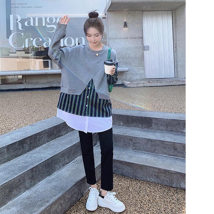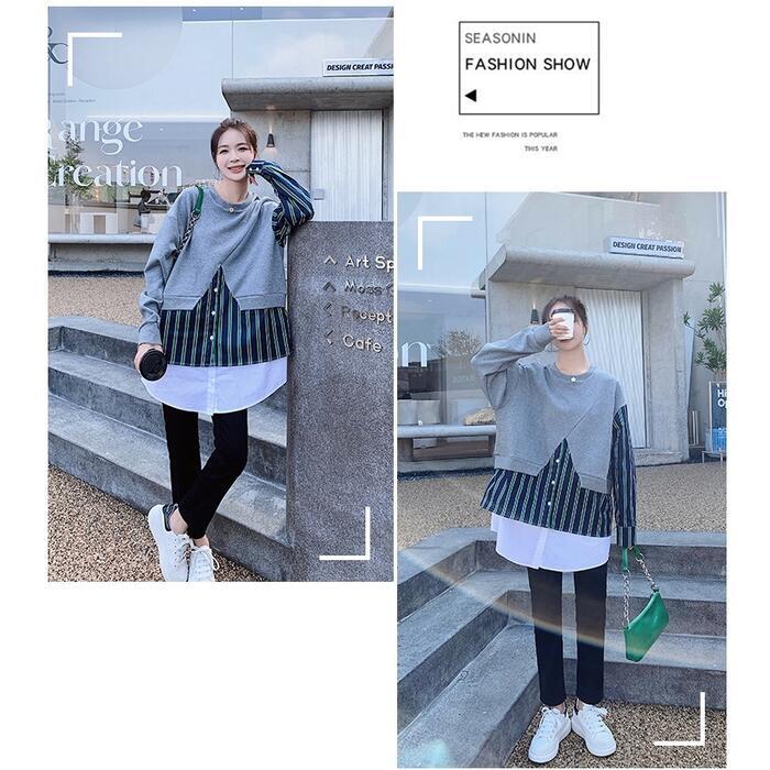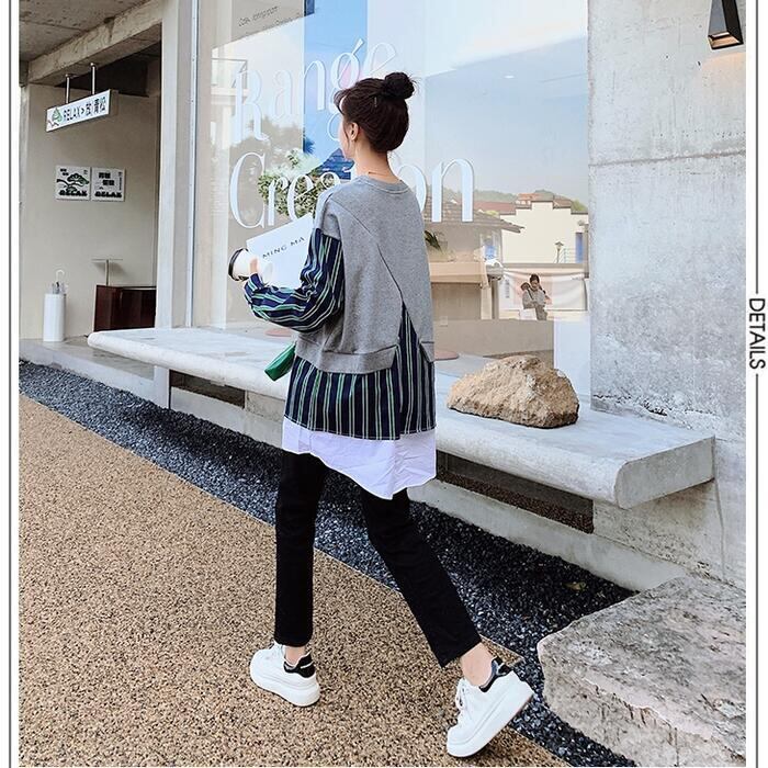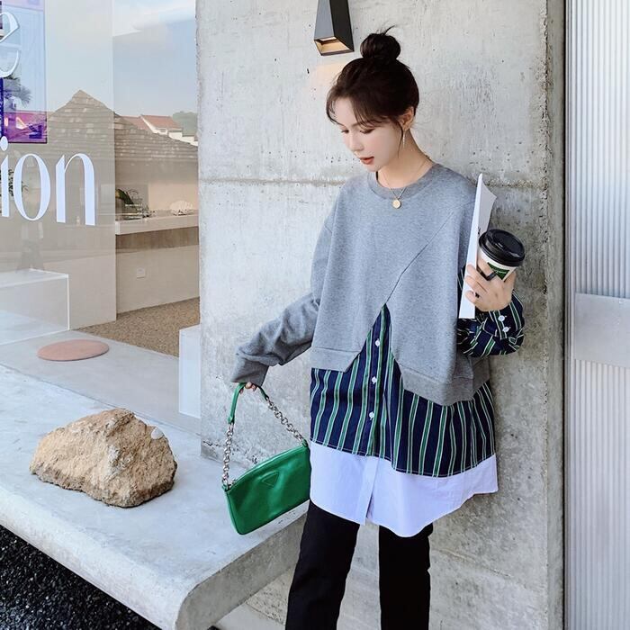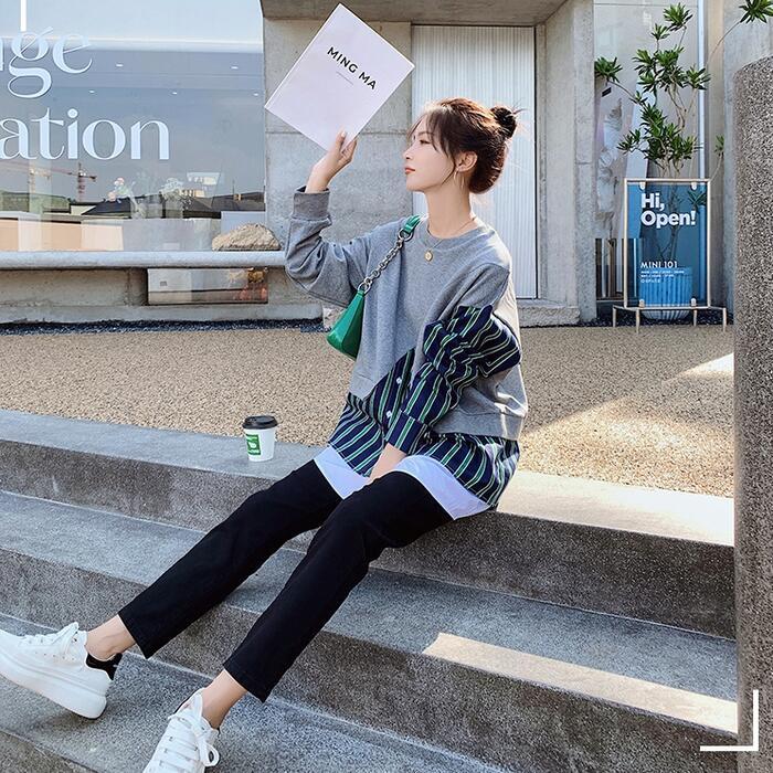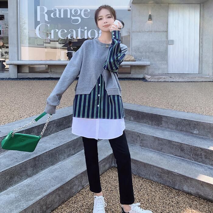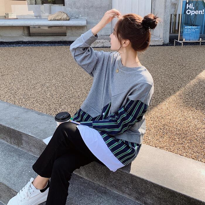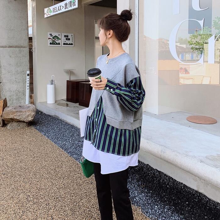 大きいサイズレイヤード風 切り替え トップス スウェット シャツ カットソー レディース プルオーバー カジュアル 長袖 ストライプ おしゃれ 大人 可愛い 異素材MIX かっこいい 韓国 おしゃれ ゆったり オーバーサイズ グレー 春 冬 秋 20代 30代 40代 50代