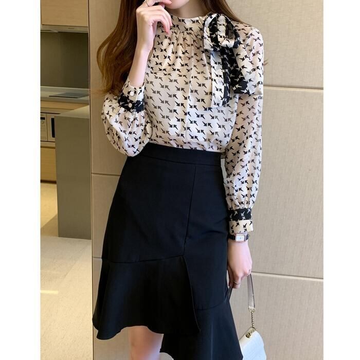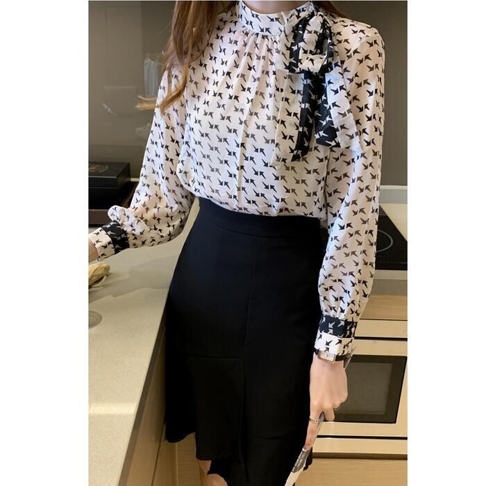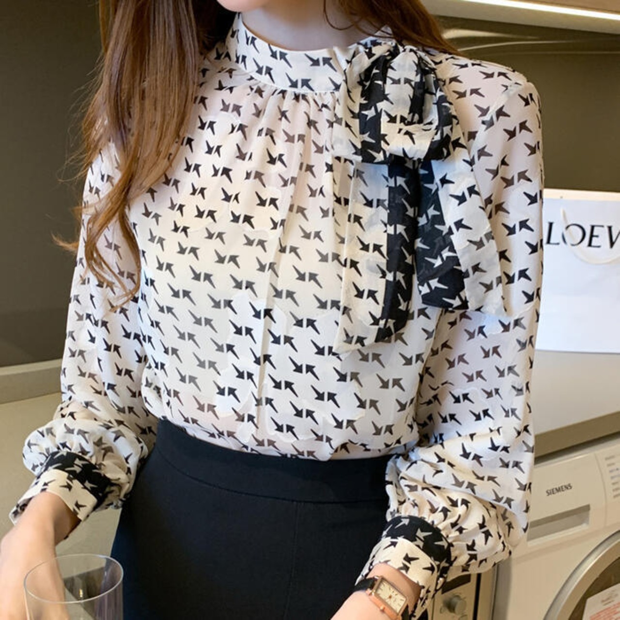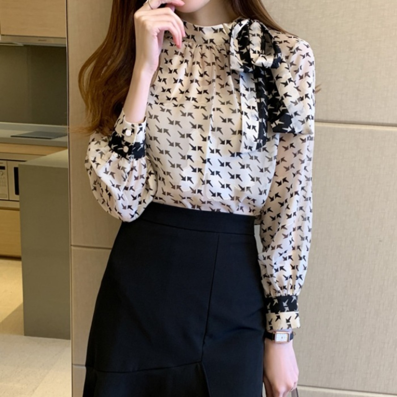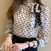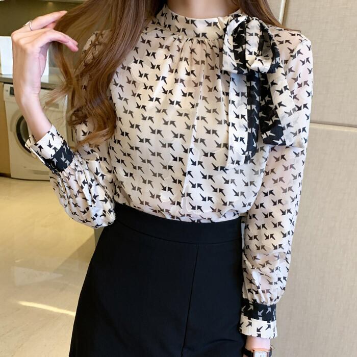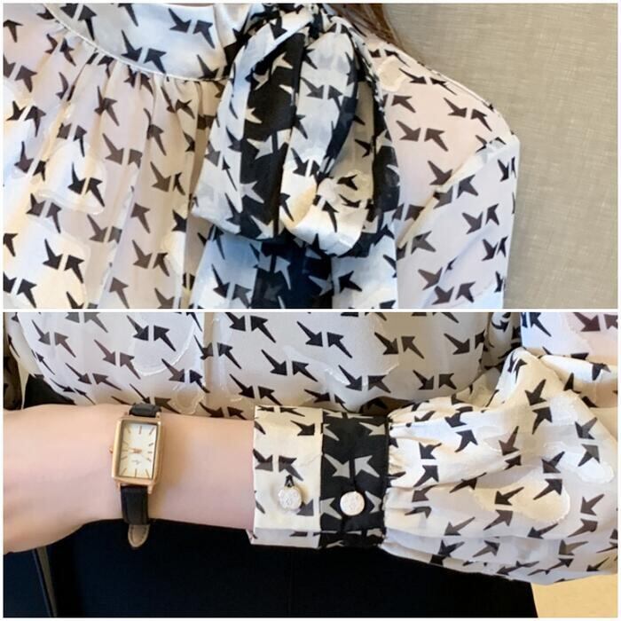 矢印のプリント柄が新鮮なシフォンブラウス。