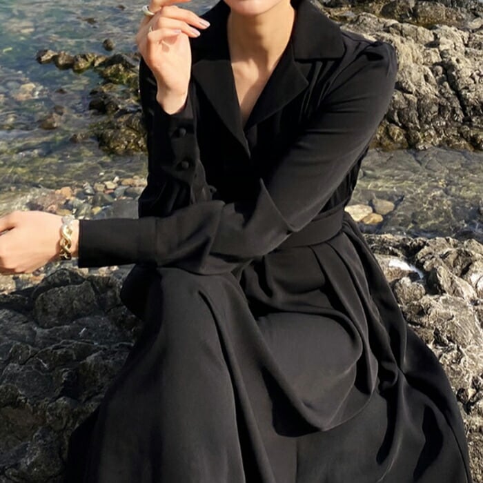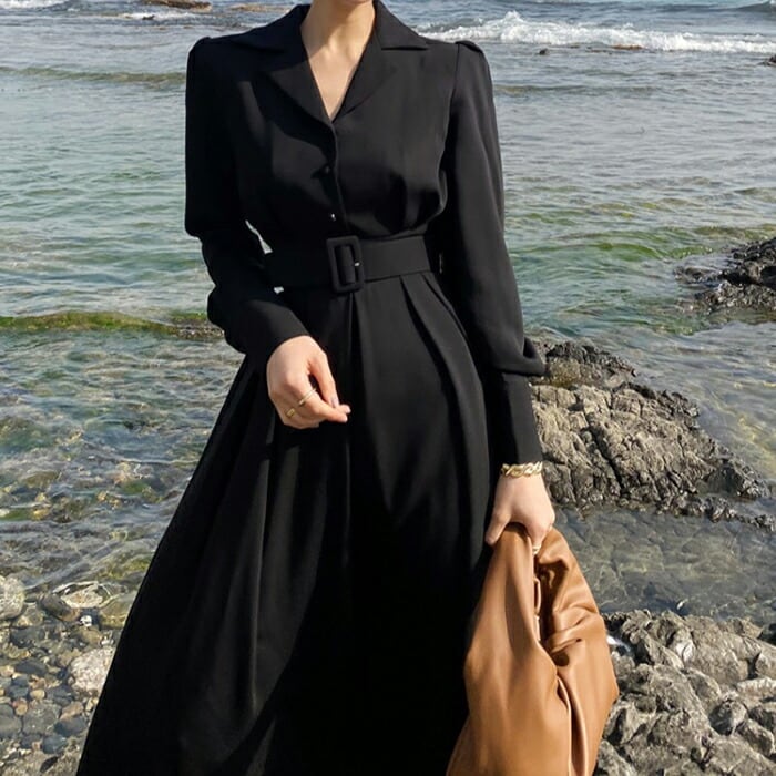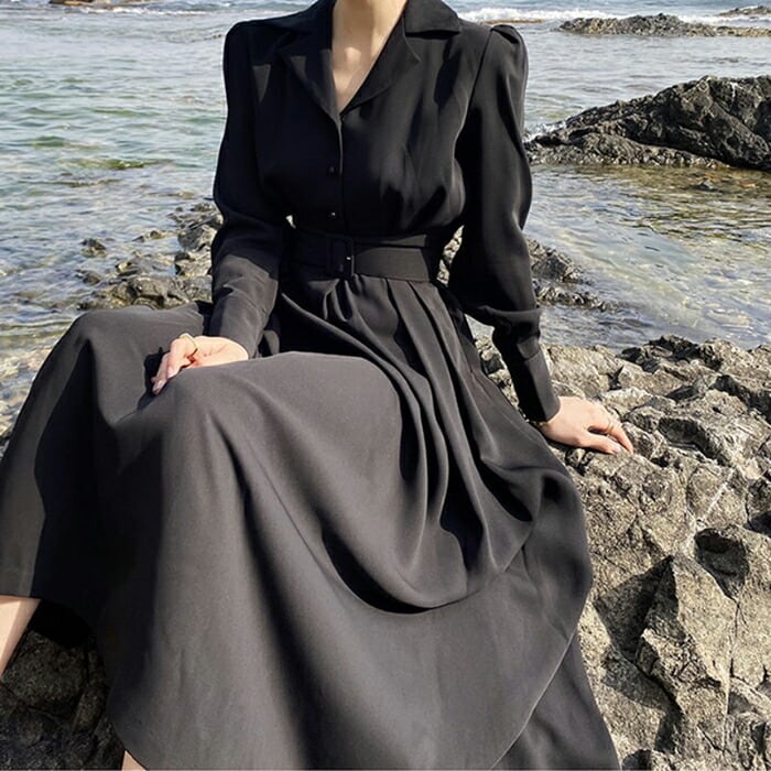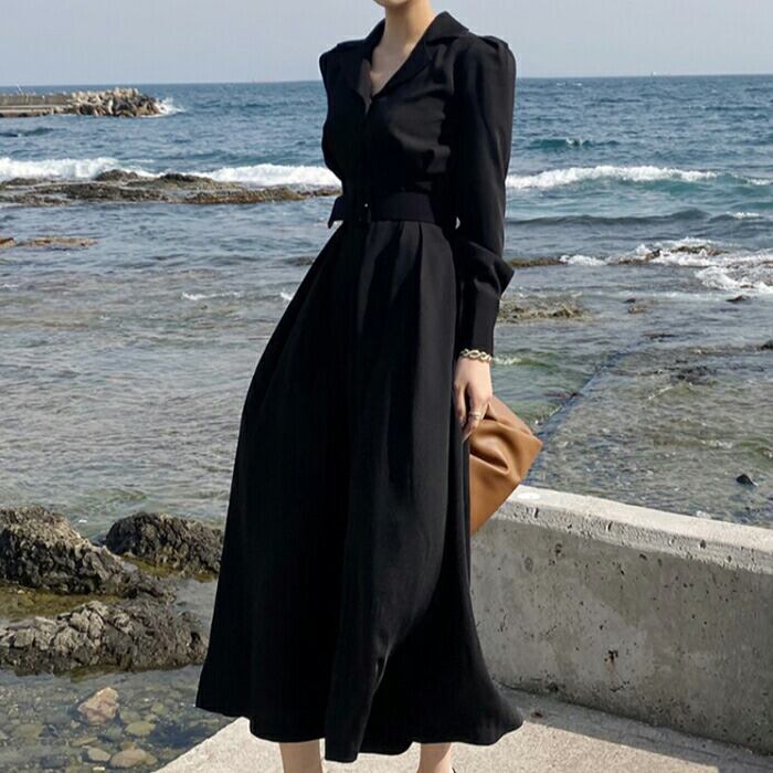 ワンピース レディース きれいめ カジュアル 袖あり Vネック スーツ襟 ミモレ丈 長袖 かっこいい ナチュラル Aライン 大人 ドレス ロングワンピ ロングスカート ワンピ ハイウエスト ブラック 黒 春 夏 秋 20代 30代 40代 50代