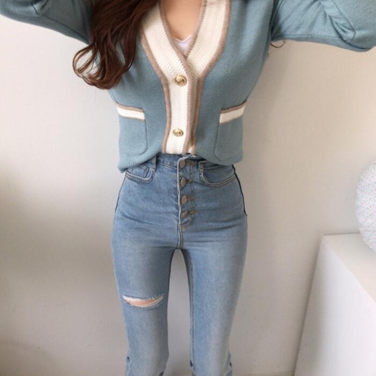 ボタンを留めてプルオーバーライクに着用するスタイルもおすすめです♪