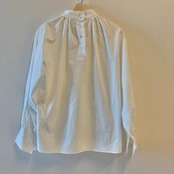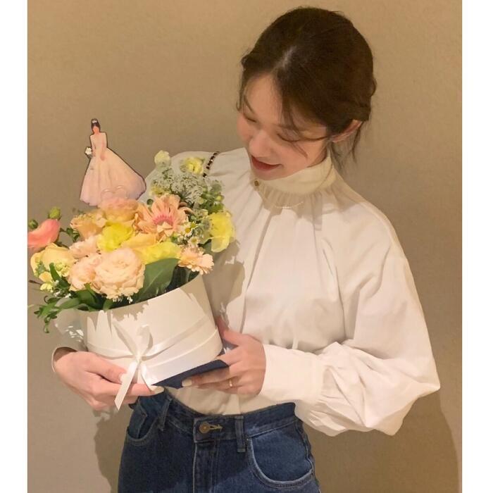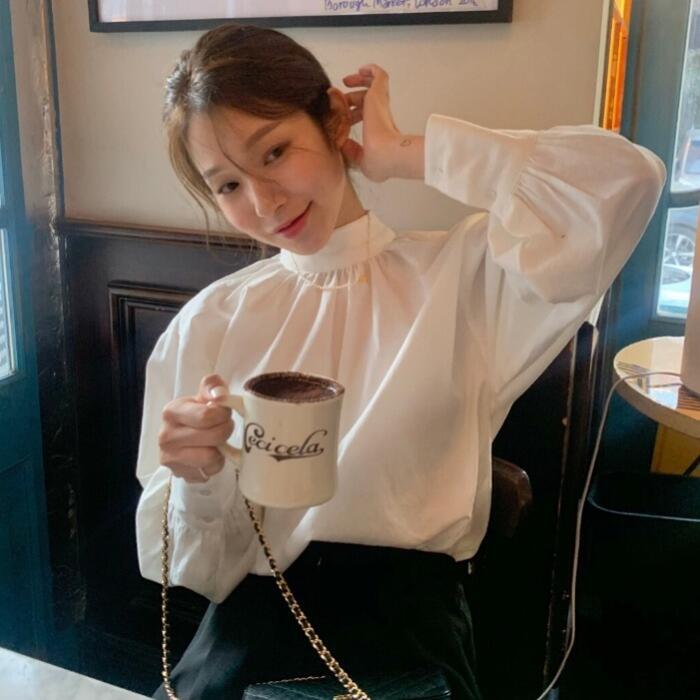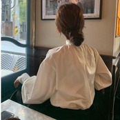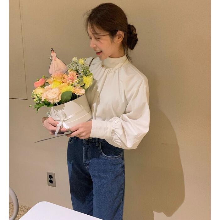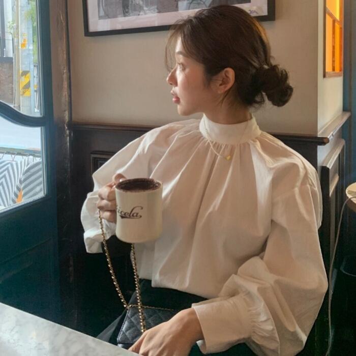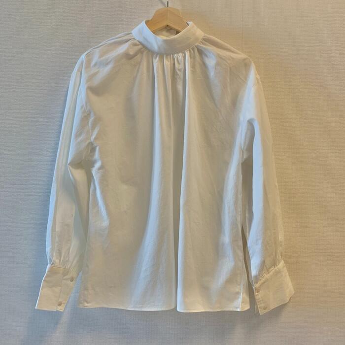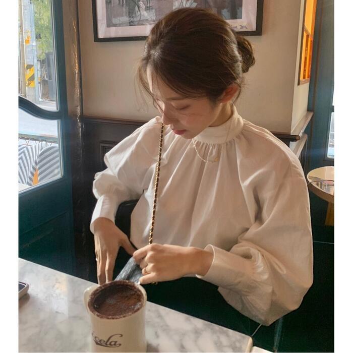 パフスリーブがポイントのスタンドカラートップス。