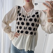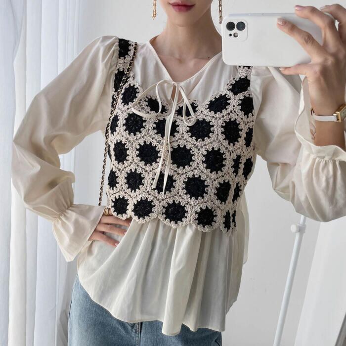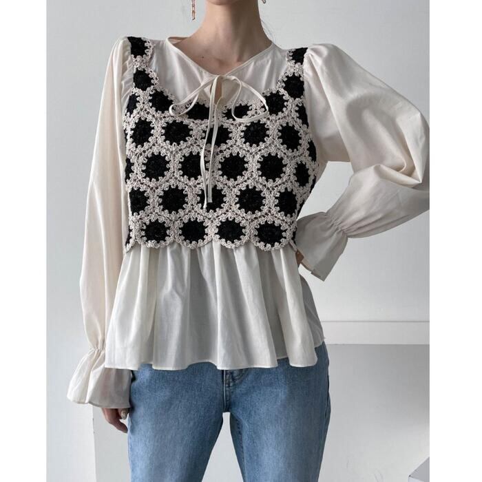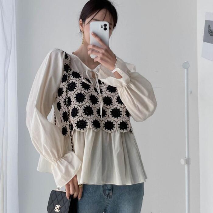 レイヤード風 トップス ブラウス シャツ 刺繍 パフスリーブ レディース きれいめ カジュアル 長袖 おしゃれ 大人 可愛い フェミニン キャンディスリーブ レトロ プルオーバー ホワイト 白 春 夏 秋 20代 30代 40代 50代