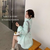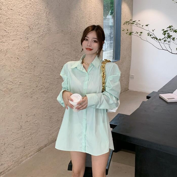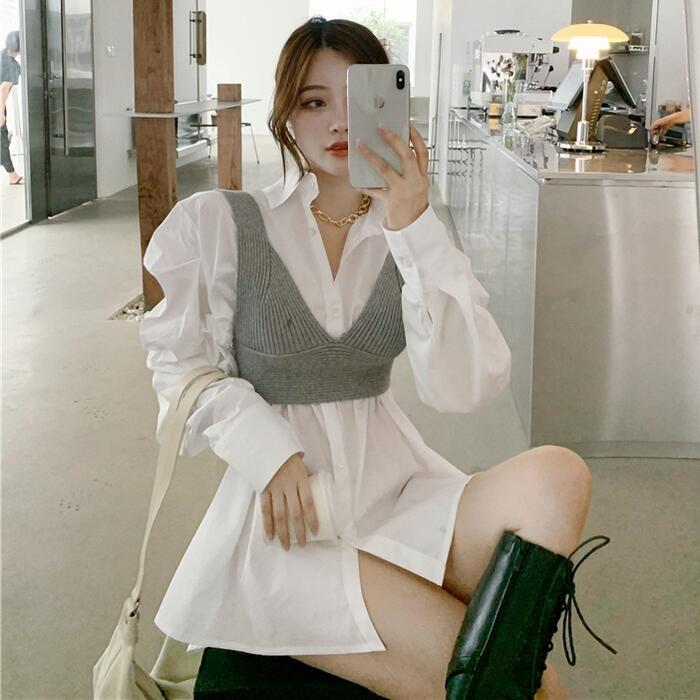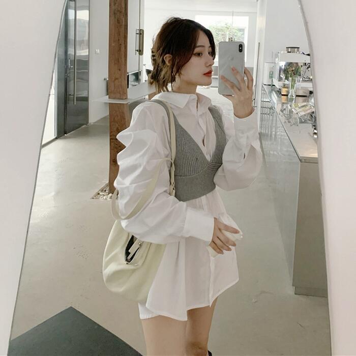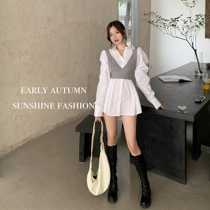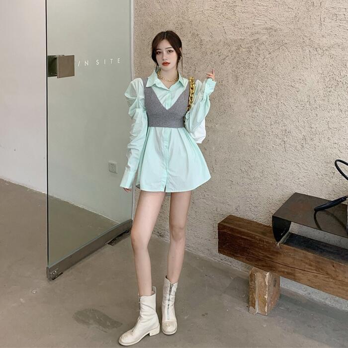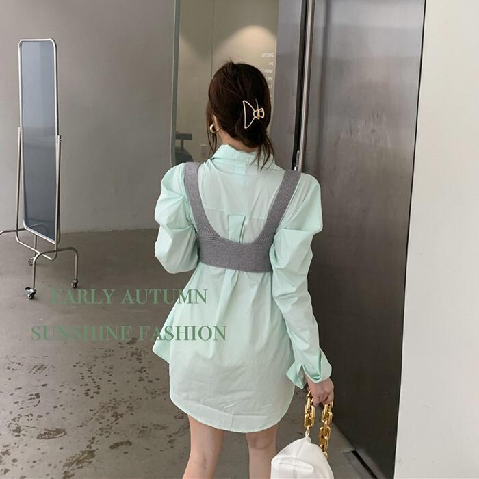 全2色 オーバーサイズレイヤード セットアップ アンサンブル シャツ ベスト レディース カジュアル きれいめ おしゃれ ベストセット ニット ブラウス 長袖 フェミニン 着回し ツーピース 2点セット グリーン 緑 ホワイト 白 春 秋 冬 20代 30代 40代 50代