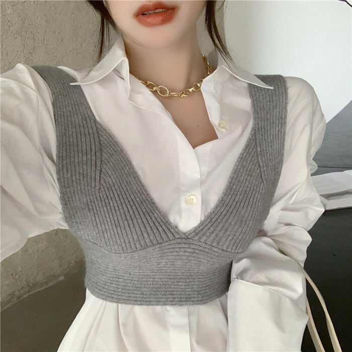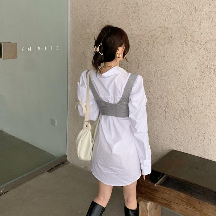 オーバーサイズのシャツとニットベストのアンサンブル。