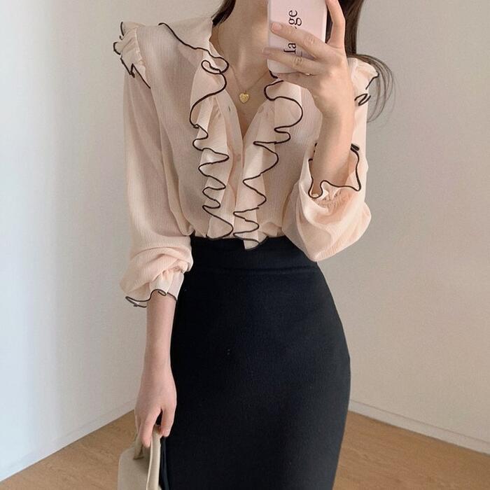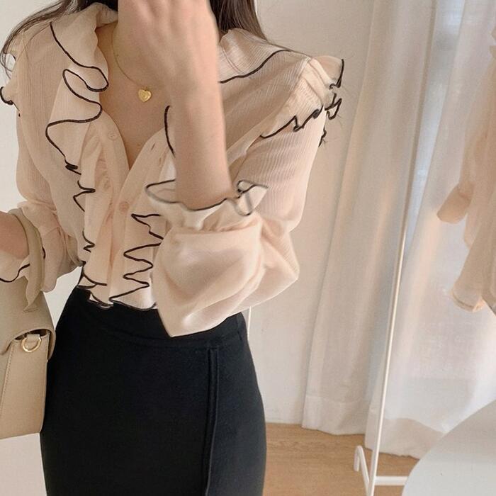 全2色 トップス ブラウス シャツ ラッフル フリル シアー 透け感 レディース エレガント きれいめ カジュアル 長袖 おしゃれ 大人 可愛い フェミニン クラシカル 韓国 通勤 ブラック 黒 ピンク 春 夏 秋 20代 30代 40代 50代