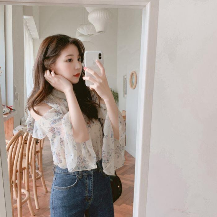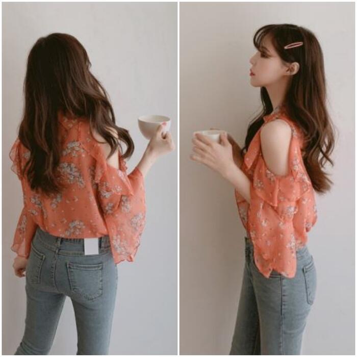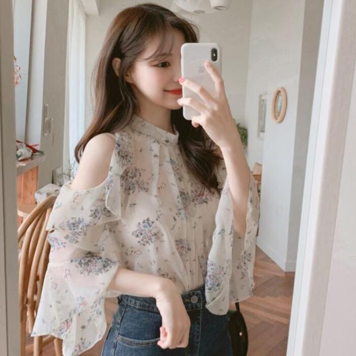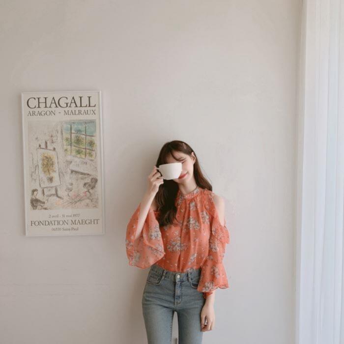 全2色 大きいサイズトップス ブラウス シャツ ラッフル フリル 花柄 ショルダーカット レディース エレガント きれいめ 七分袖 カジュアル スタンドカラー おしゃれ 大人 可愛い フェミニン クラシカル 韓国 ホワイト 白 オレンジ 春 夏 秋 20代 30代 40代 50代