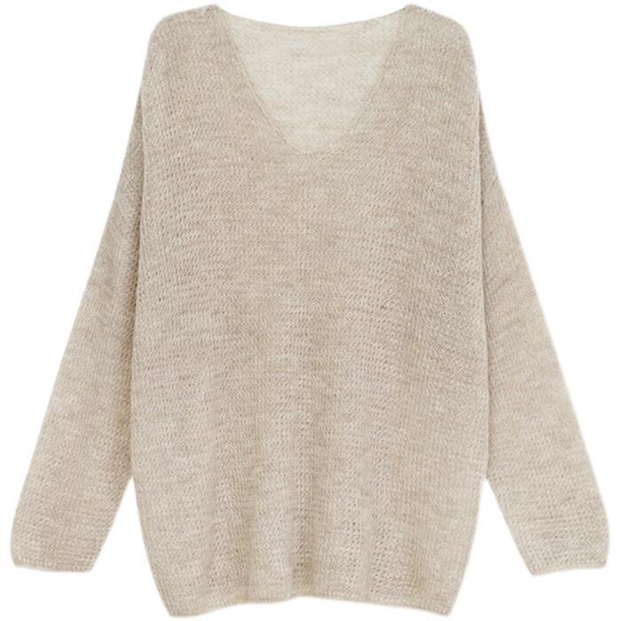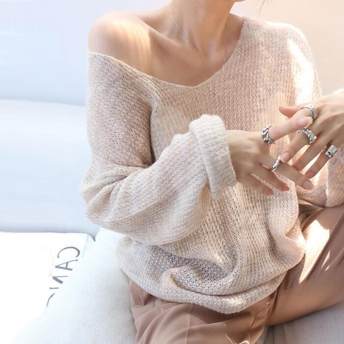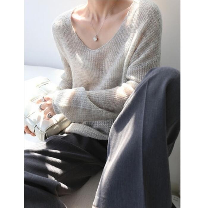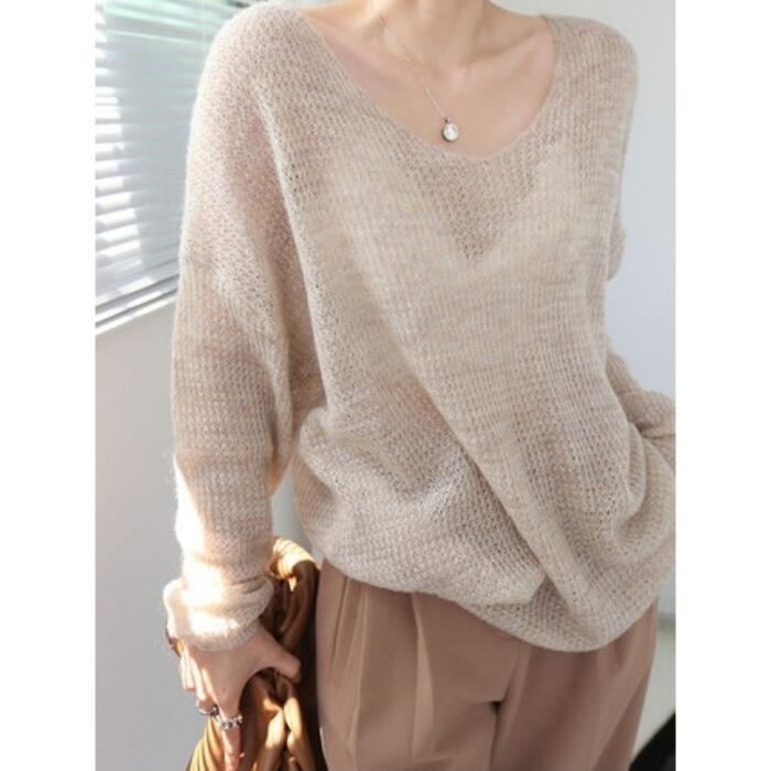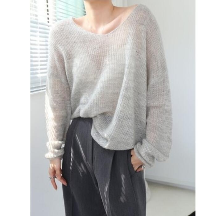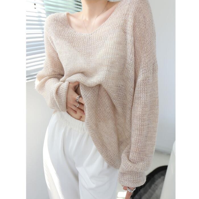 全2色 トップス ニット カットソー セーター ローゲージ レディース きれいめ 長袖 カジュアル おしゃれ 大人 可愛い フェミニン シンプル 透け感 韓国 ナチュラル ゆったり 大きいサイズ ベージュ グレー 春 夏 秋 20代 30代 40代 50代