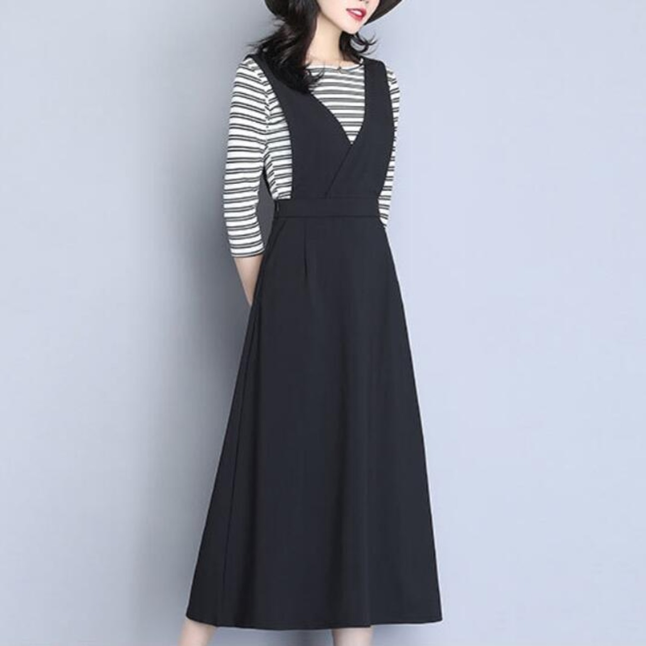 ジャンパースカート ワンピース ロングワンピ サロペットスカート ノースリーブ Vネック ミモレ丈 レディース ドレス ハイウエスト きれいめ カジュアル 大人 可愛い Aライン レイヤード 大きいサイズ ブラック 黒 春 秋 夏 20代 30代 40代 50代