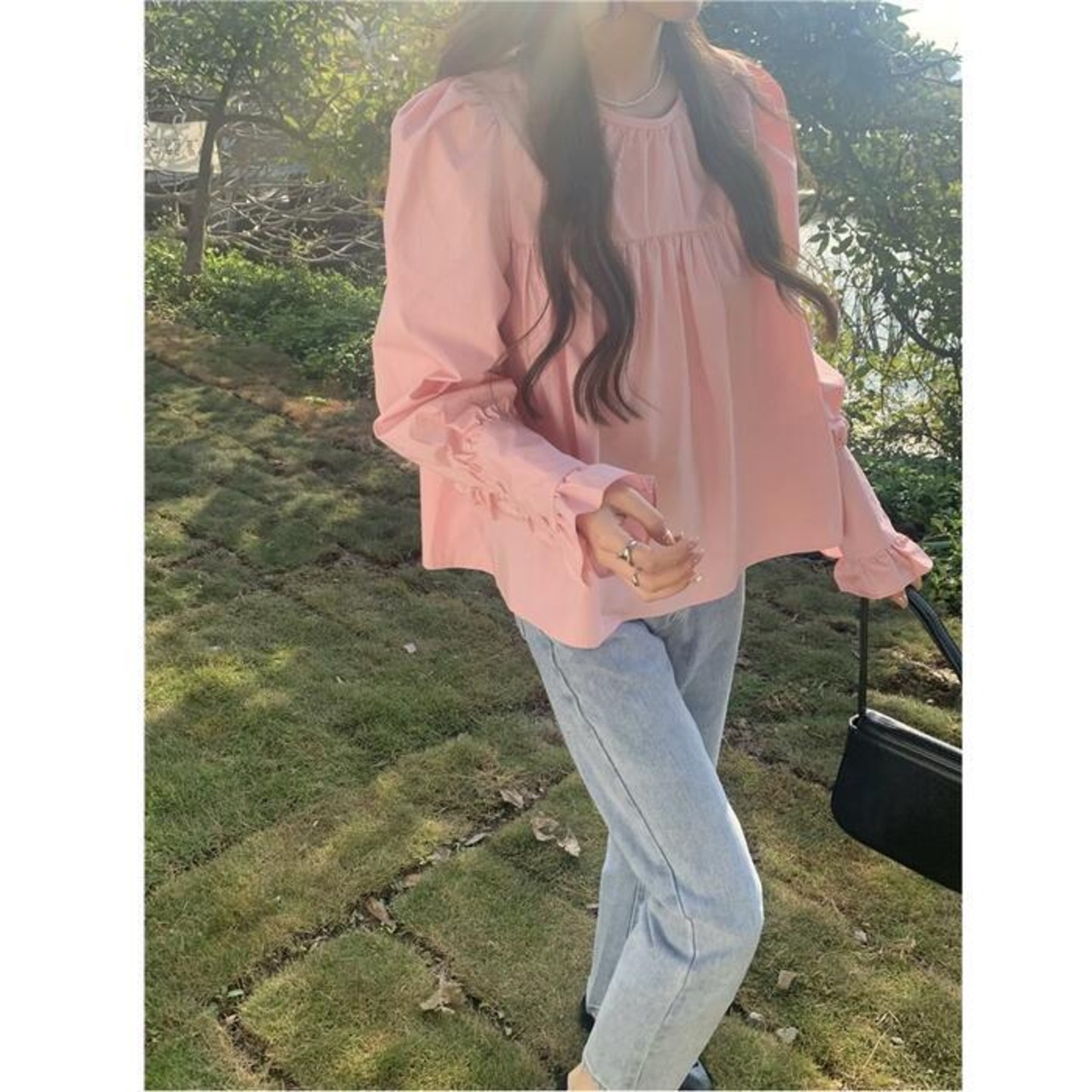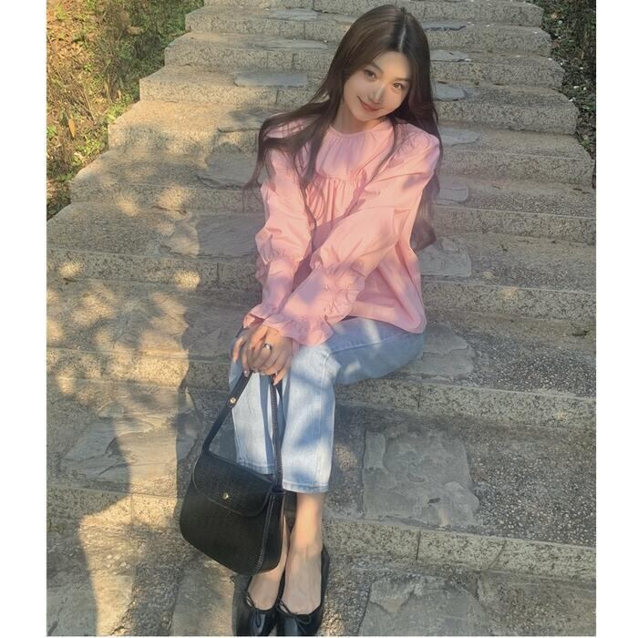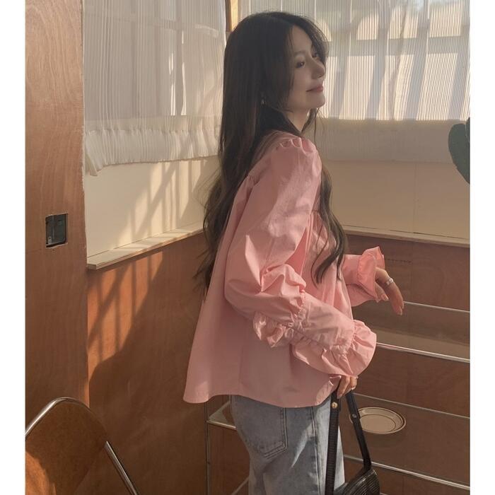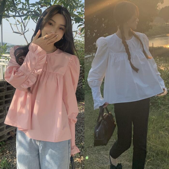 全2色 トップス シャツ ブラウス パフスリーブ フリル レディース エレガント きれいめ カジュアル 長袖 おしゃれ 大人 可愛い フェミニン ゆったり 体型カバー ガーリー クラシカル シンプル ホワイト 白 ピンク 春 夏 秋 20代 30代 40代 50代