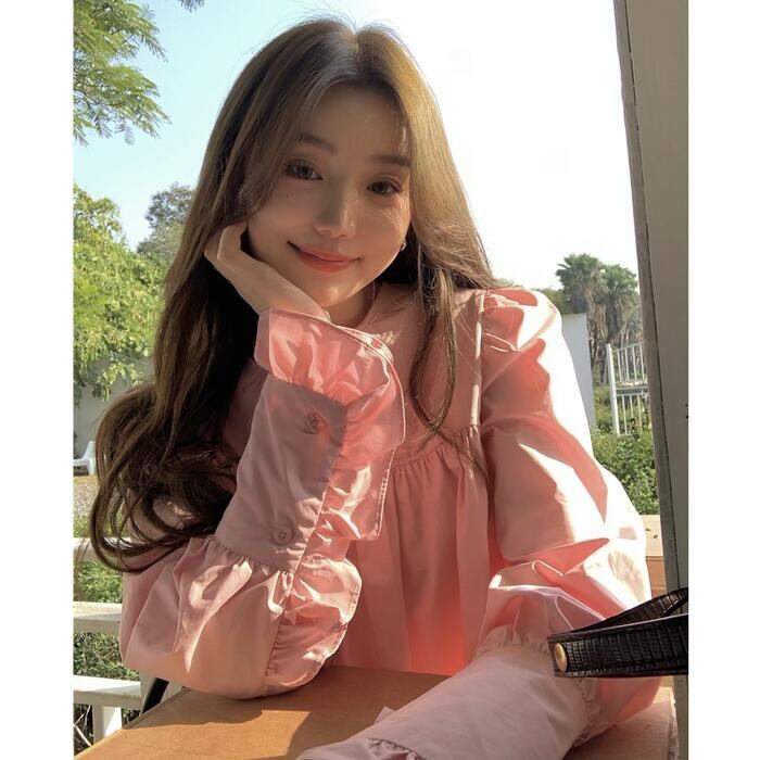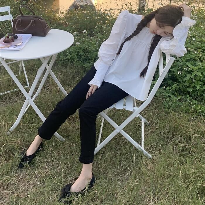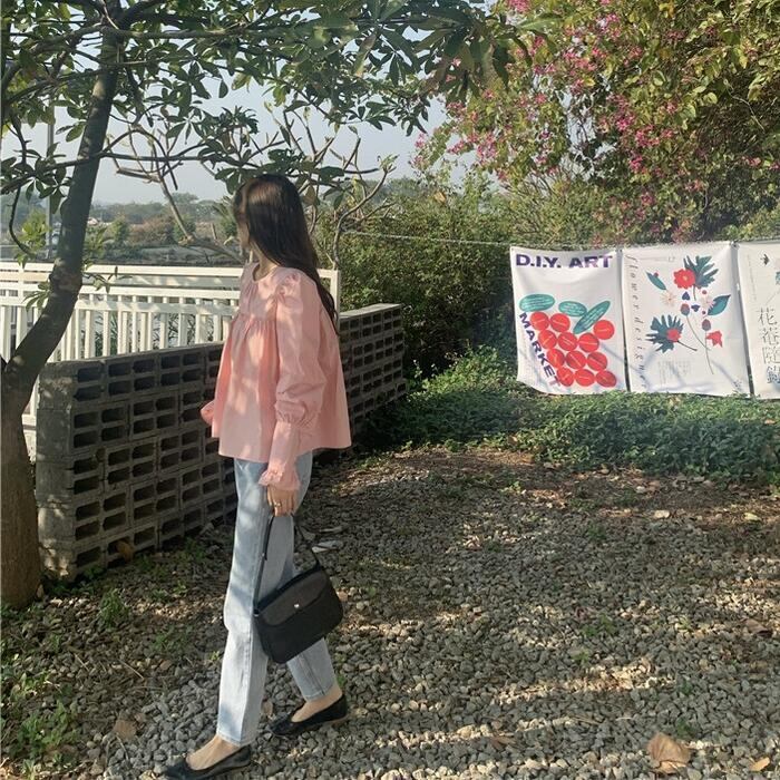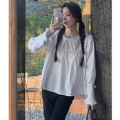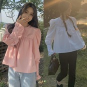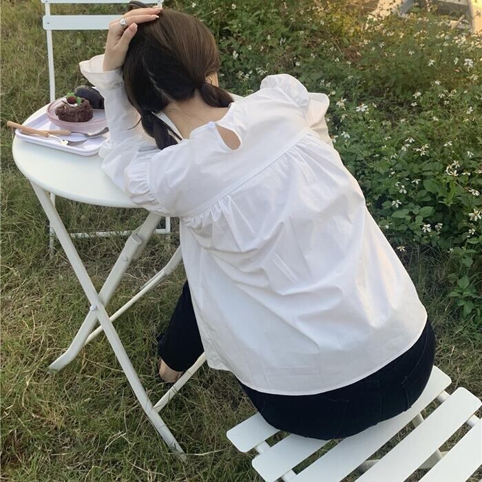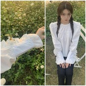 ぽわんとボリュームのある袖とフリルが甘めなガーリーブラウス。