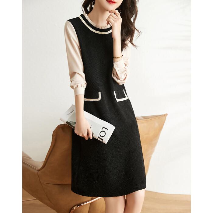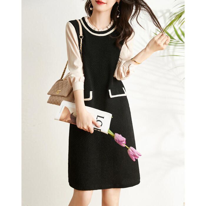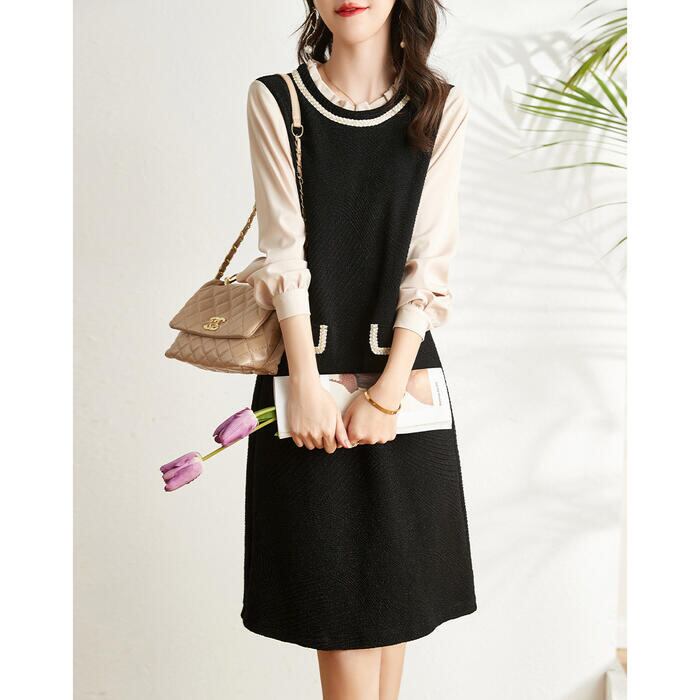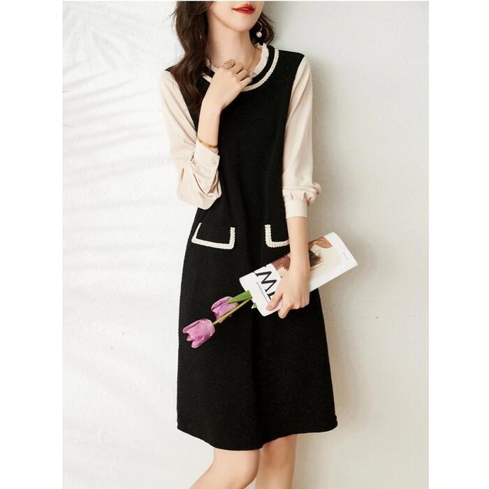 レイヤード風 切り替え フリル ワンピース ロングワンピ きれいめ カジュアル ひざ丈 長袖 ワンピ レディース ドレス シンプル 大人可愛い フェミニン Aライン オフィス 大きいサイズ ブラック 黒 春 秋 冬 20代 30代 40代 50代