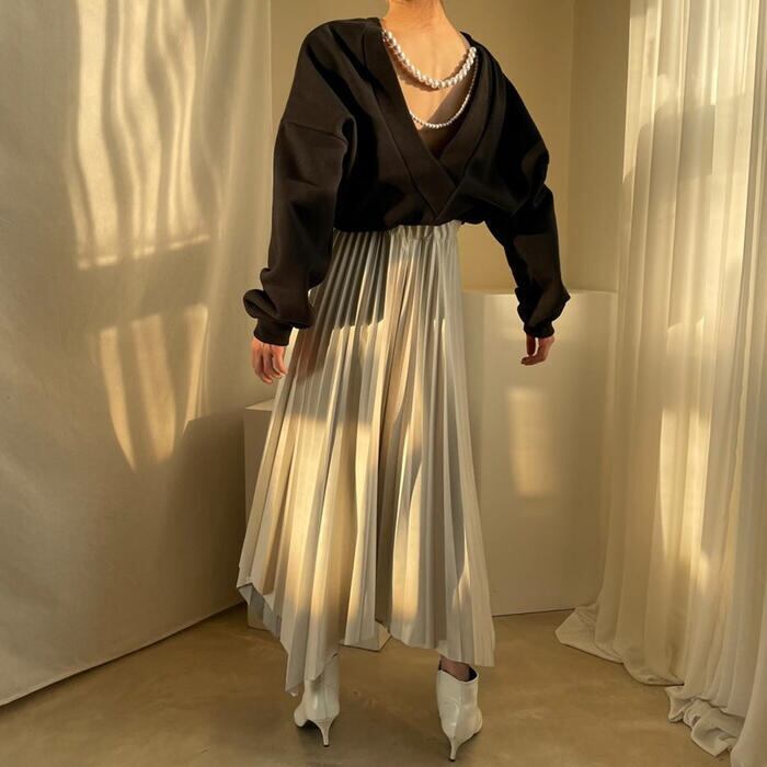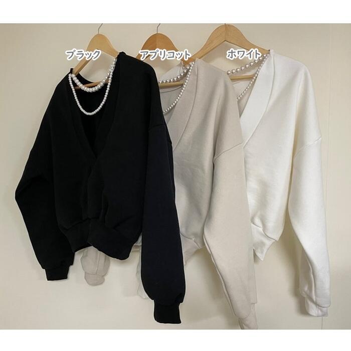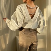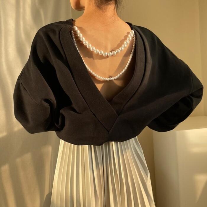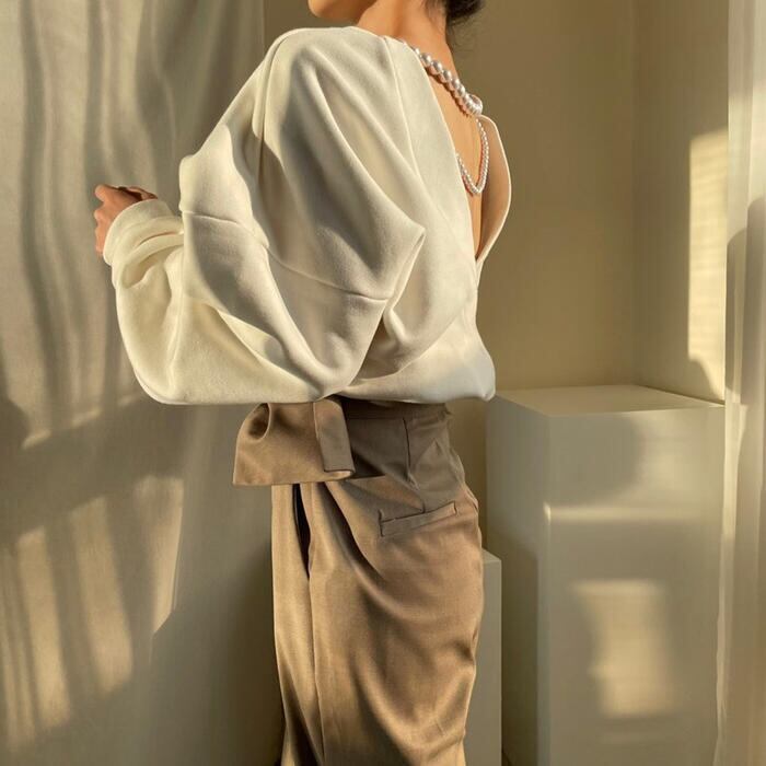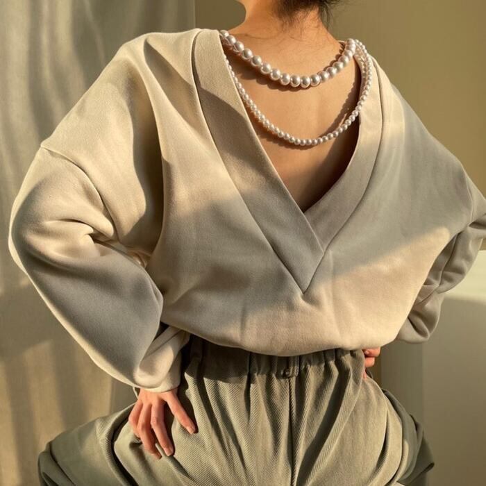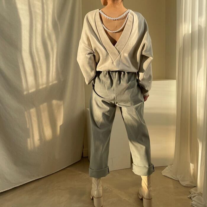 背中にパールをあしらったカジュアルフェミニンなトップス。