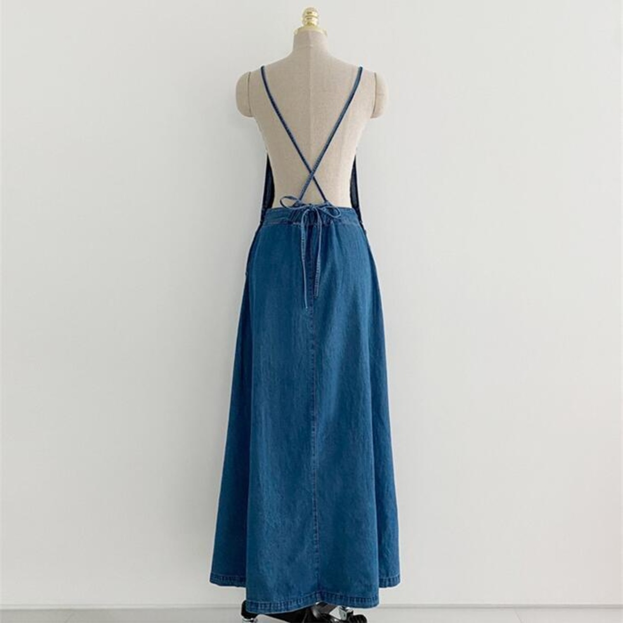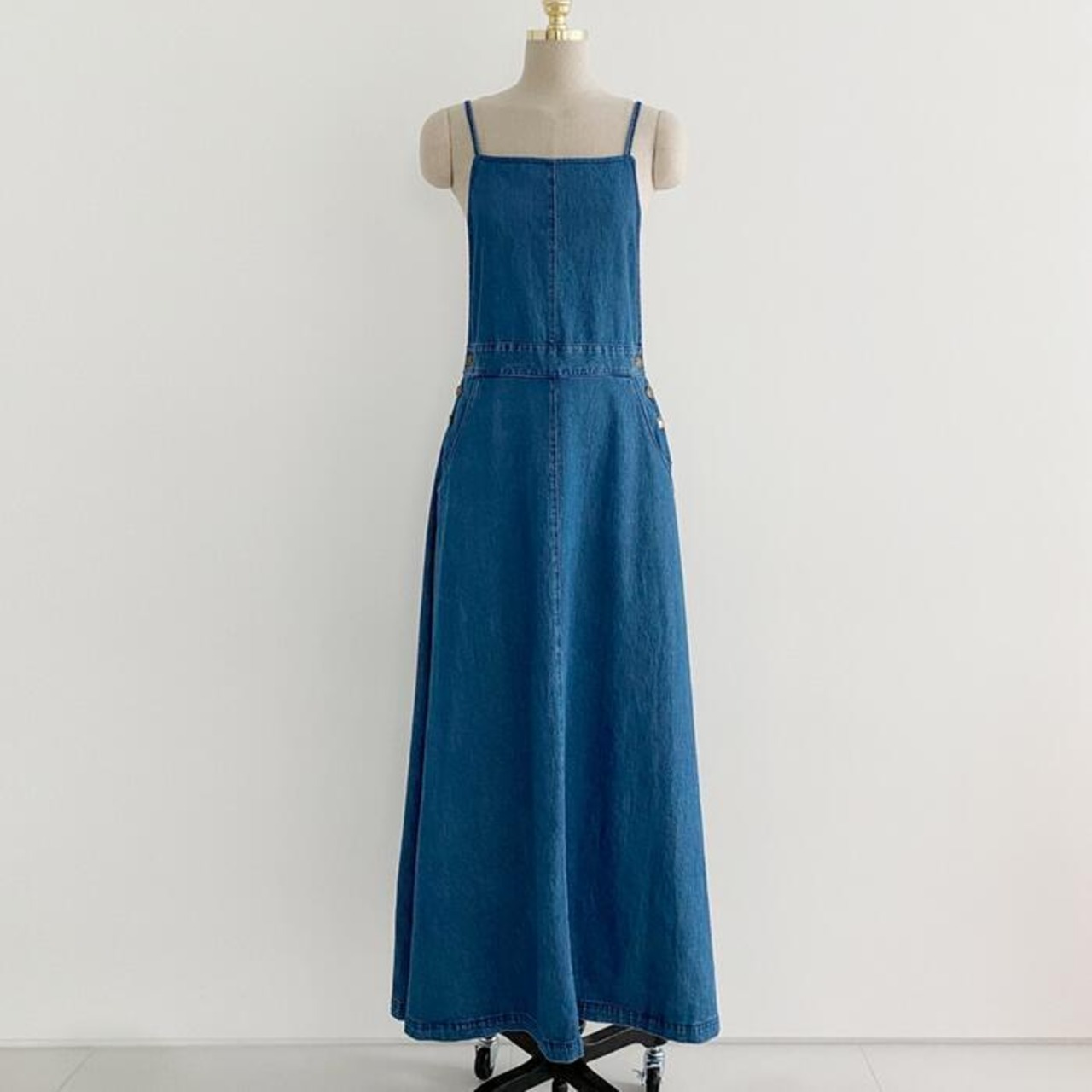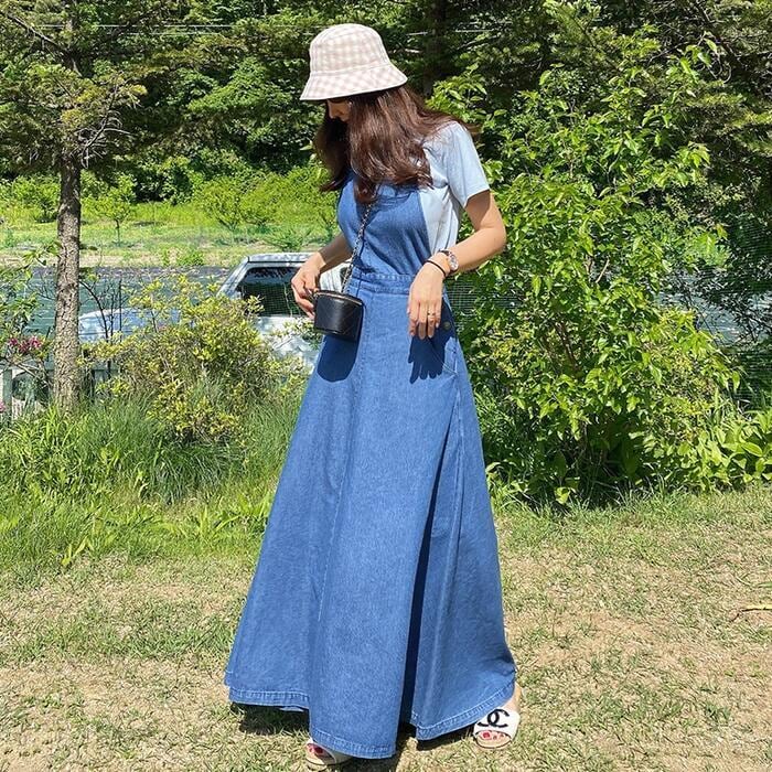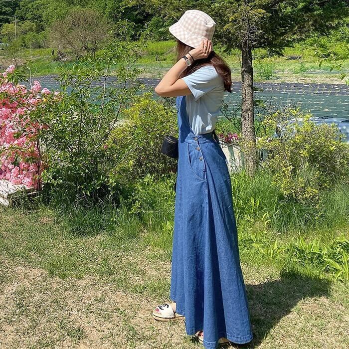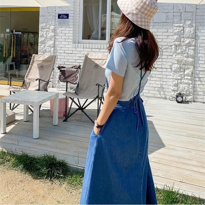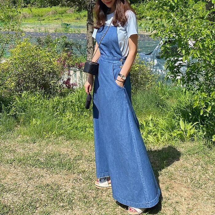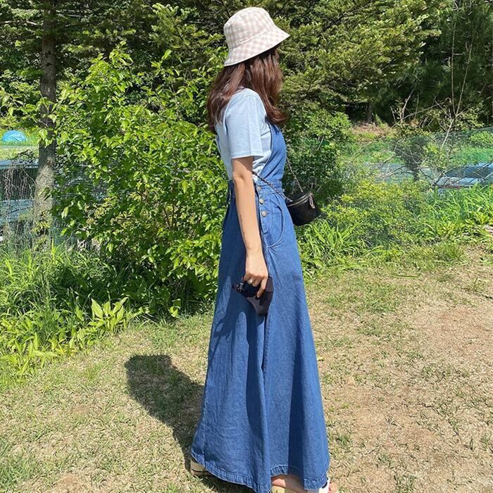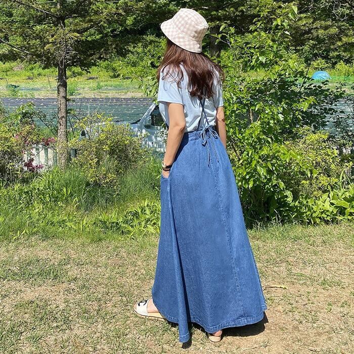 Aラインシルエットのデニムサロペットスカート。