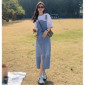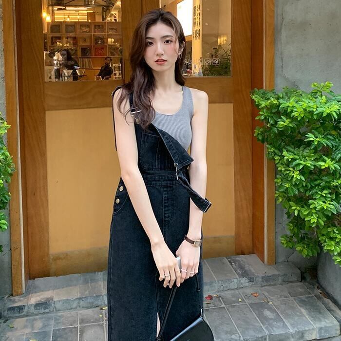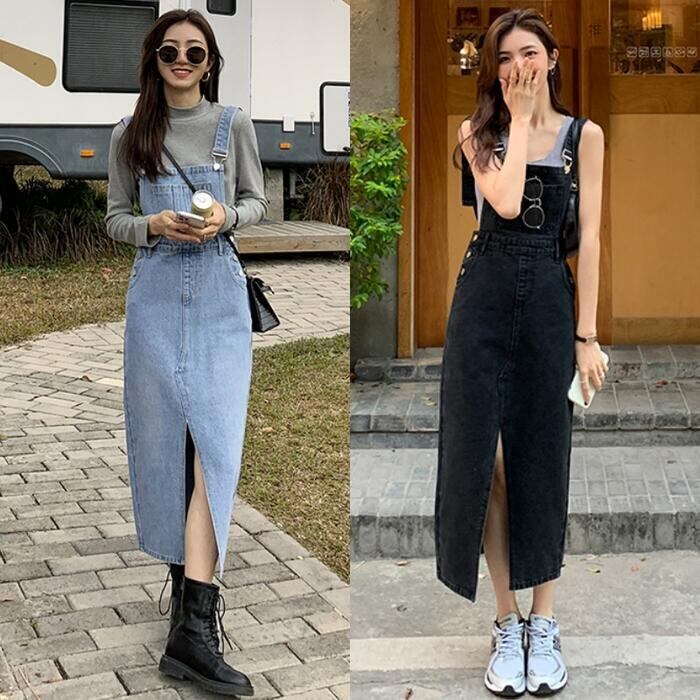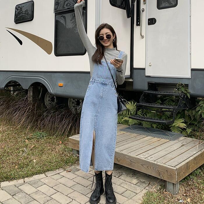 全2色 デニム ジャンパースカート サロペットスカート ワンピース ロングワンピ ミモレ丈 レディース ワンピ ドレス ノースリーブ 大人 可愛い カジュアル Aライン ブルー 青 グレー オールシーズン 春 秋 夏 20代 30代 40代 50代