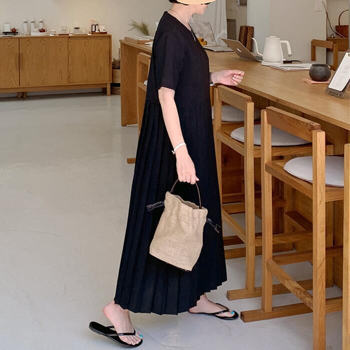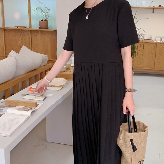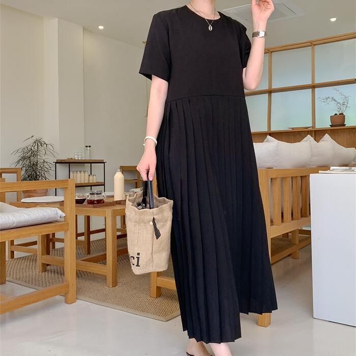 全2色 大きいサイズワンピース プリーツ 切り替え ナチュラル 半袖 涼しい おしゃれ 袖あり ミモレ丈 カジュアル レディース ワンピ ドレス 半袖 きれいめ ゆったり 体型カバー リラックス ベージュ ブラック 春 夏 秋 20代 30代 40代 50代