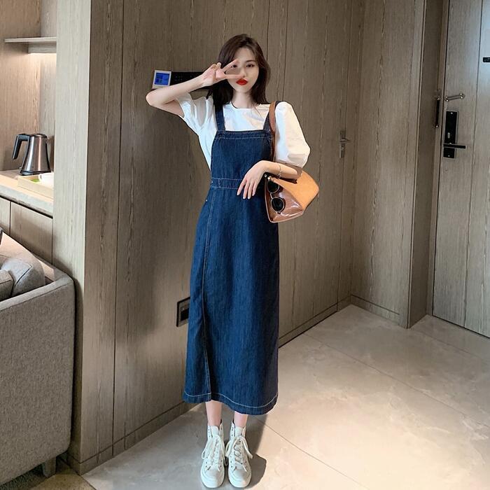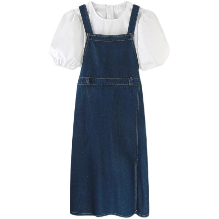 大きいサイズセットアップ 2点セット トップス パフスリーブ Tシャツ ブラウス ジャンパースカート デニム ワンピース サロペットスカート 半袖 ミモレ丈 おしゃれ 大人 可愛い きれいめ カジュアル シンプル ホワイト 白 ブルー 青 春 秋 冬 20代 30代 40代 50代