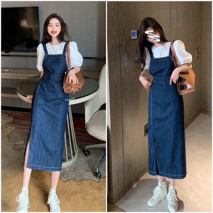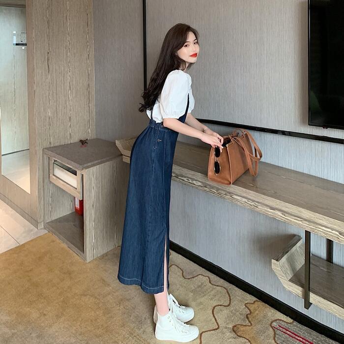 パフスリーブブラウスとデニムジャンパースカートのセットアップ。