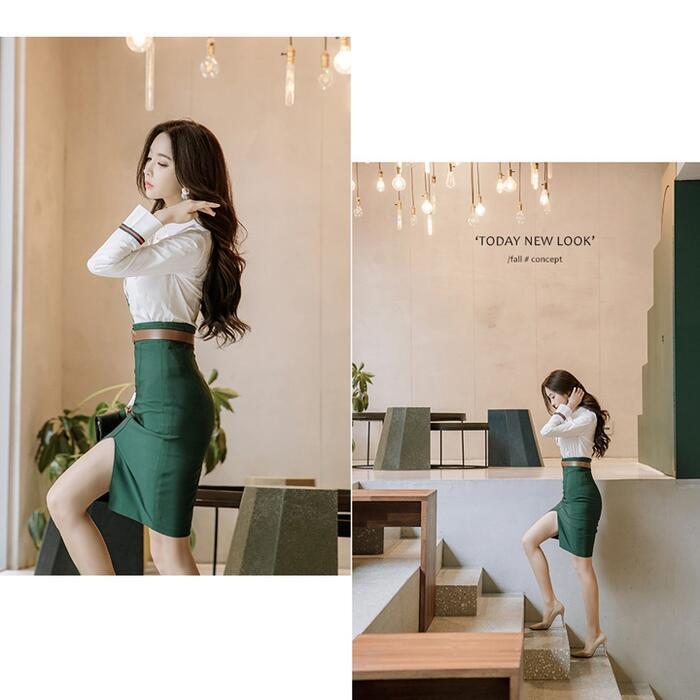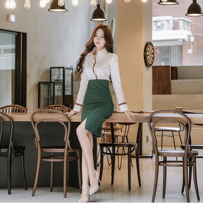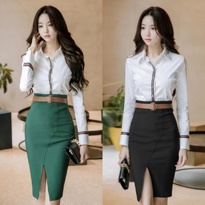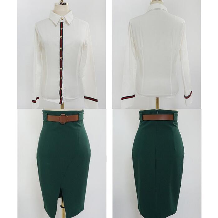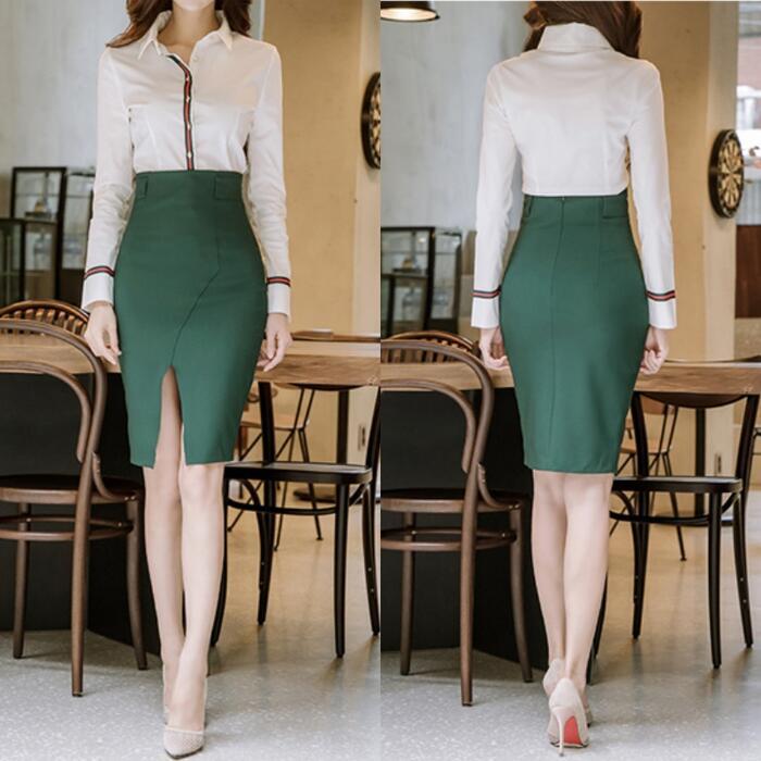 全2色 大きいサイズセットアップ 2点セット トップス シャツ スカート ブラウス タイト ひざ丈 長袖 おしゃれ 大人可愛い カジュアル シンプル きれいめ エレガント オフィス 通勤 ホワイト 白 グリーン 緑 春 秋 冬 20代 30代 40代 50代