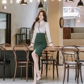 ラインデザインがポイントのシャツとタイトスカートのセットアップ。