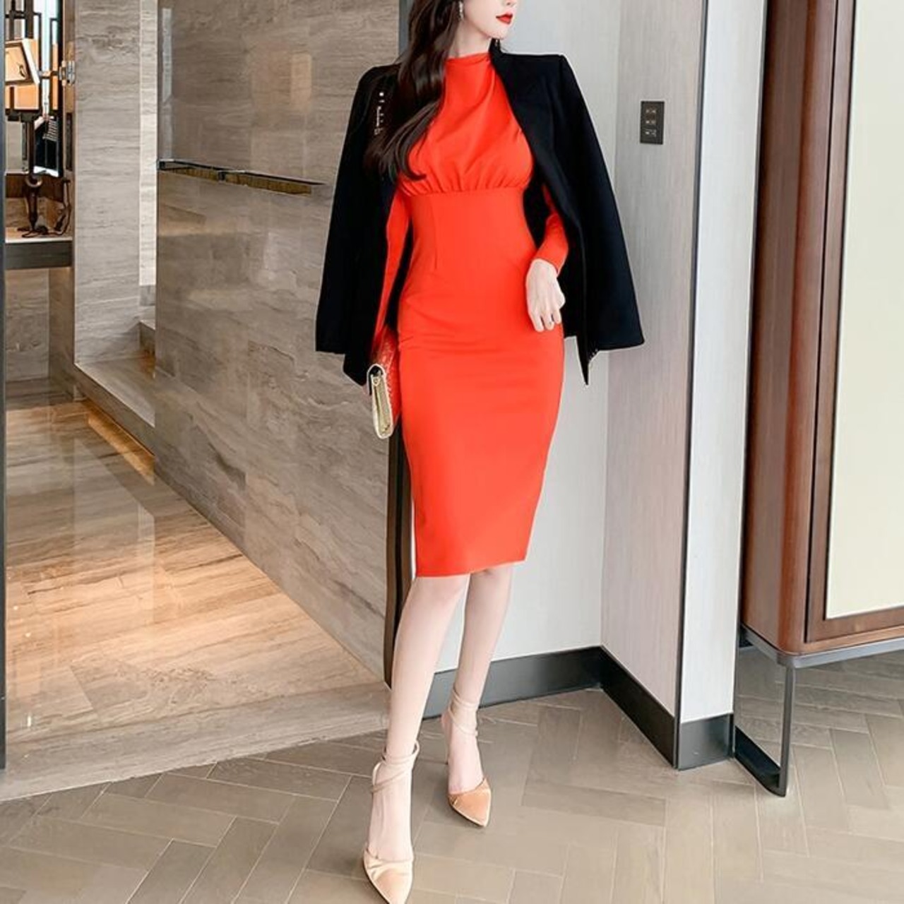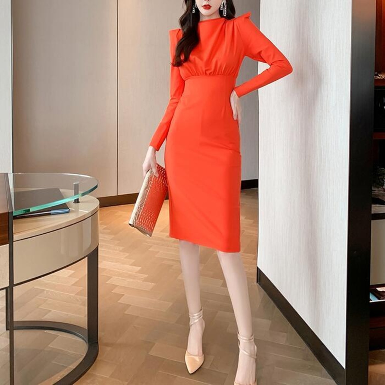 大きいサイズ結婚式 フォーマル パーティー ワンピース 袖あり ミモレ丈 エレガント レディース ワンピ ドレス 長袖 きれいめ 二次会 セレモニー フェミニン タイト ハイウエスト お呼ばれ オレンジ 春 秋 冬 20代 30代 40代 50代