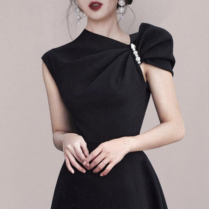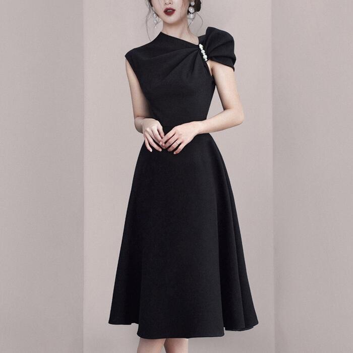 大きいサイズ結婚式 フォーマル パーティー ワンピース パール ミモレ丈 エレガント レディース ワンピ ドレス ノースリーブ アシンメトリー きれいめ 二次会 セレモニー フェミニン ハイウエスト ブラック 黒 春 秋 夏 20代 30代 40代 50代