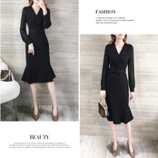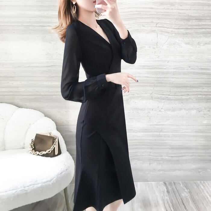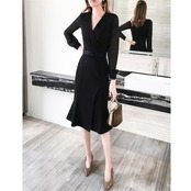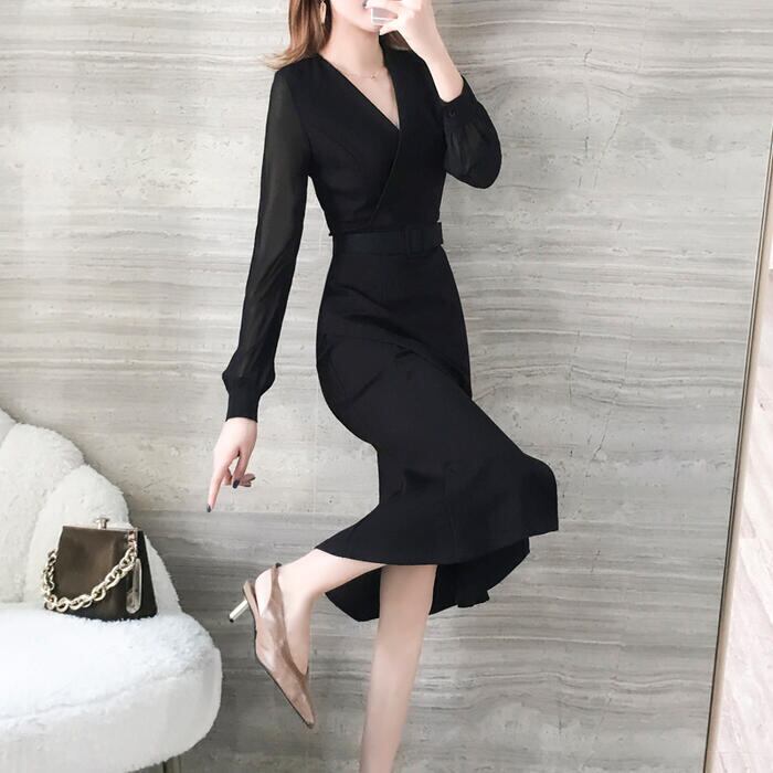 大きいサイズ結婚式 フォーマル パーティー ワンピース 袖あり シアー ミモレ丈 エレガント レディース ワンピ ドレス 長袖 カシュクール きれいめ 二次会 セレモニー フェミニン ハイウエスト ブラック 黒 春 秋 夏 20代 30代 40代 50代